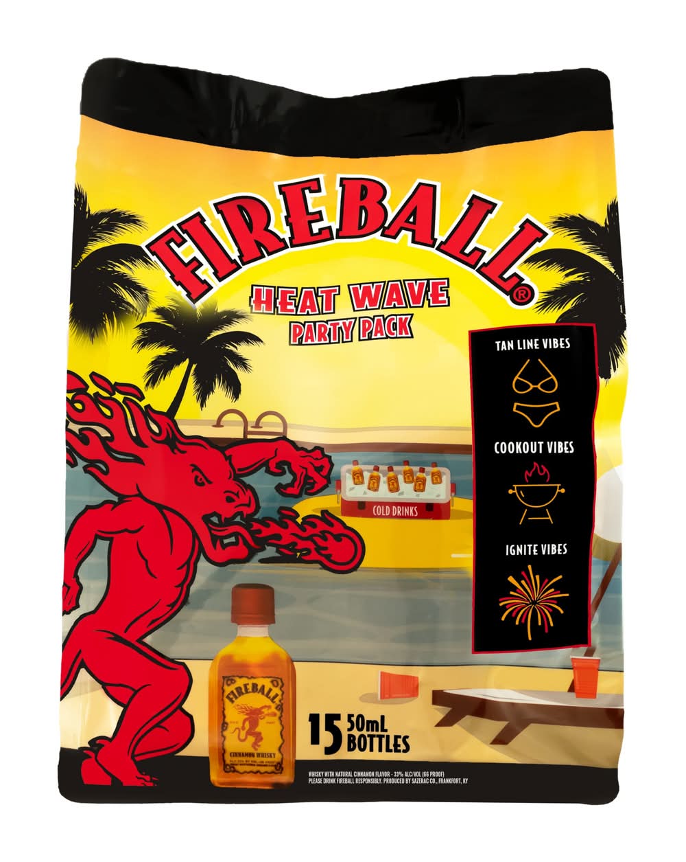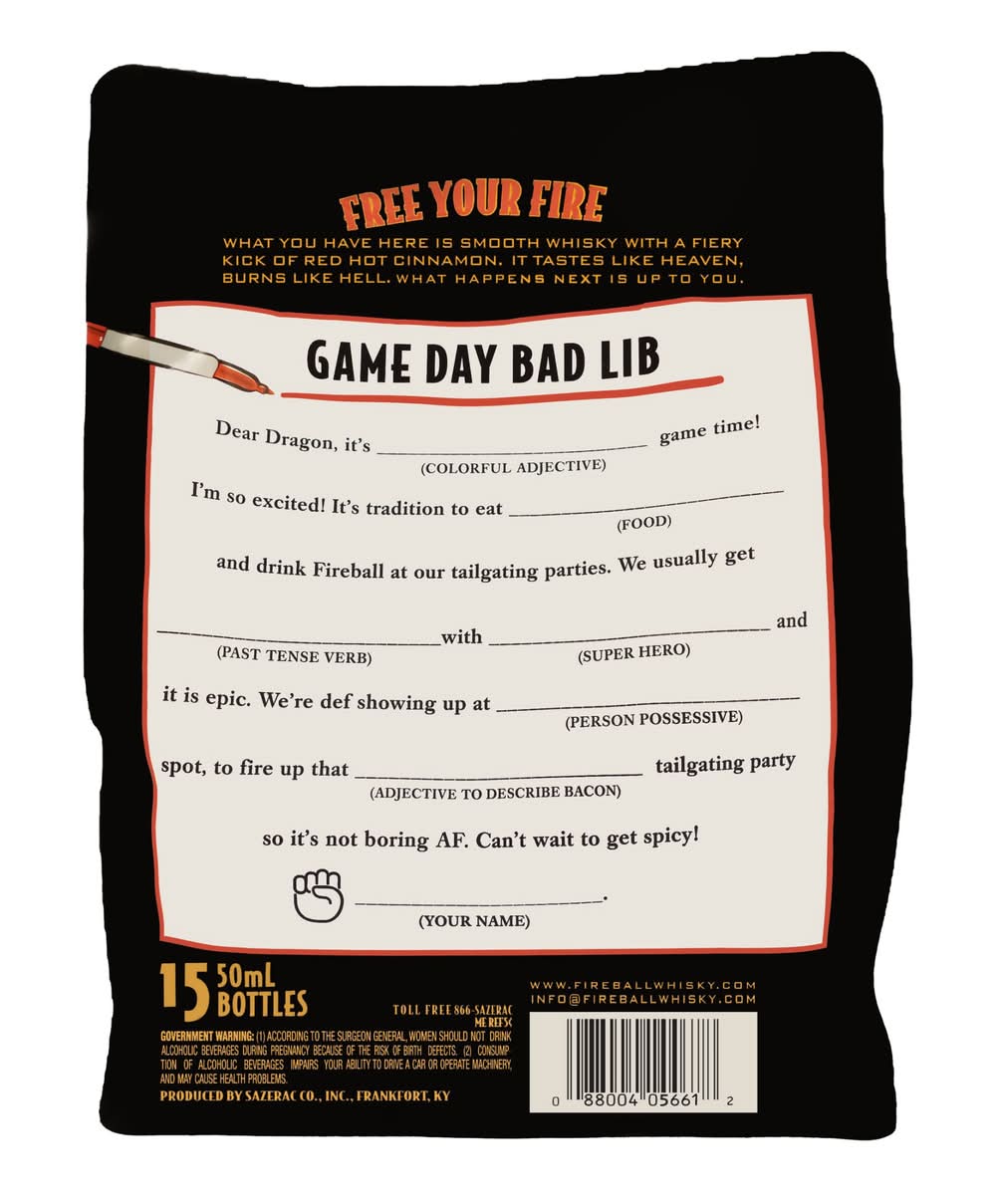 Ignite the Night with the heavenly taste and ferocious burn of Fireball Cinnamon Whisky. Fireball is the perfectly blended Canadian whisky made with real cinnamon for a fiery kick of red hot cinnamon flavor. Fireball is America’s #1 shot brand and #1 whiskey brand, making this cinnamon whisky the iconic choice for celebrating with friends at home or your favorite bar. At 33% alcohol by volume, a Fireball shot is the perfect whiskey shot for pregaming before a chill night out. Fireball Canadian Whisky also tastes great when enjoyed straight or added to your favorite mixed drinks or a classic cocktail. The cinnamon flare of Fireball hard liquor also enhances your favorite hard seltzer, hard cider and other alcoholic drinks. With countless ways to enjoy Fireball Cinnamon Whisky, bending the rules is easy - and delicious. Store Fireball at room temperature or store and pour straight from your freezer to enjoy an icy, spicy shot. Fireball is one of a kind, not to be replaced by any other copycat cinnamon whiskey. Fireball tastes like heaven and burns like hell. • Pack size: 15 • Alcohol by volume: 33%