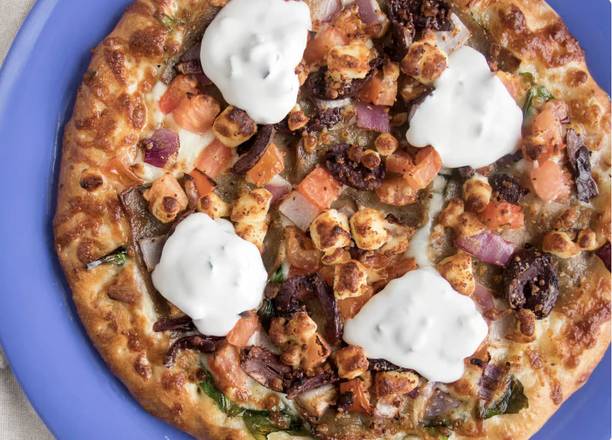 Best entrée, taste of Cincinnati 2010; second best in Midwest, Napics 2011. Garlic butter base, fresh spinach, kalamata olives, tomatoes, red onions, gyro meat, mozzarella, provolone, and feta cheeses. Finished with tzatziki sauce.