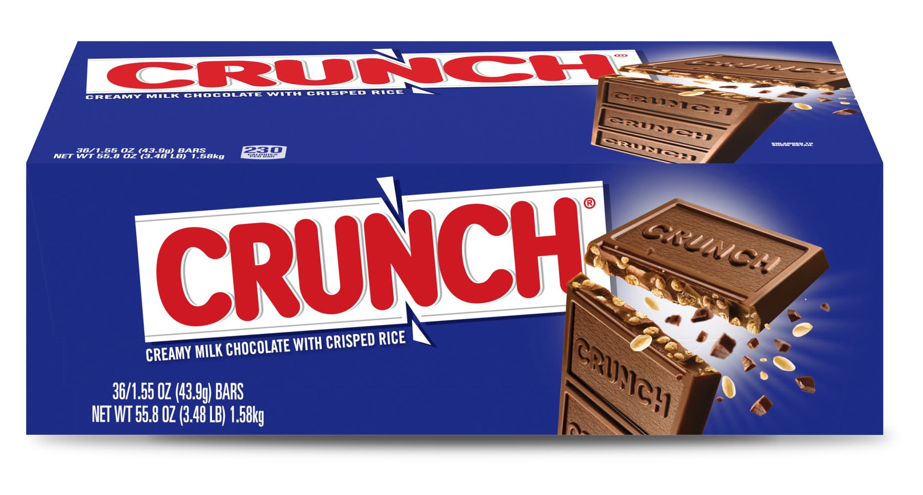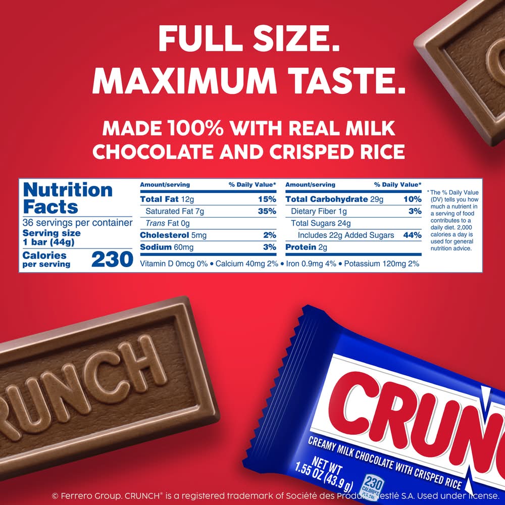 Get your sweet treat on with CRUNCH milk chocolate bar. This pack of 36 individually wrapped full-size milk chocolate candy bars is packed with creamy chocolate and crispy rice for that classic texture you can’t resist. Since 1938, CRUNCH has delivered joy to chocolate lovers with its irresistible appeal and crunchy chocolate texture. Known for its signature crisp and satisfying bite, it remains a nostalgic favorite for fans of classic confections. Crafted with 100% milk chocolate and made without artificial flavors or colors, each chocolate bar offers a craveable mix of sweetness and airy crisped rice in a convenient size that’s easy to grab, share or keep all to yourself. Whether you're on an office break, binging your favorite show, or enjoying during family game night, CRUNCH candy bar is a go-to treat for all kinds of moments. Turn up the fun with this 36-count pack of individually wrapped full-size candy bars, perfect for sharing with friends, stocking up your pantry, or simply treating yourself to a big bite of chocolate joy. • Number of servings: 36 • Ferrero U.S.A. Inc., Parsippany, NJ, 07054