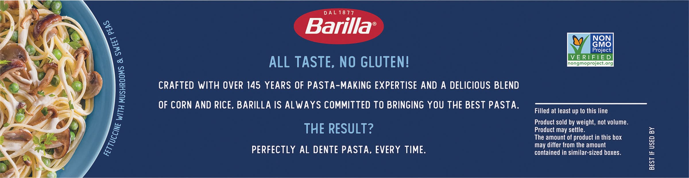 Produced on a dedicated gluten free line. No wheat ingredients. Non-GMO Project verified. Classic taste. Al dente perfection in 13-14 minutes. All taste, no gluten! Crafted with over 145 years of pasta-making expertise and a delicious blend of corn and rice, It is always committed to bringing you the best pasta. The amount of product in this box may differ from the amount contained in similar-sized boxes.