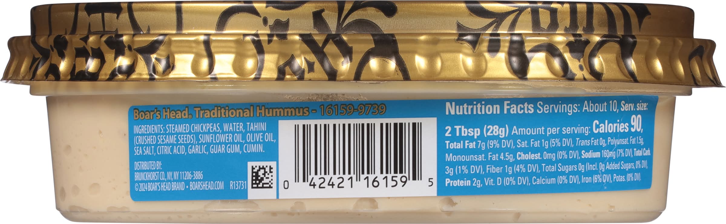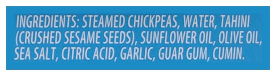 Ingredients: Steamed Chickpeas, Water, Tahini (Crushed Sesame Seeds), Sunflower Oil, Olive Oil, Sea Salt, Citric Acid, Garlic, Guar Gum, Cumin Contains: Gluten