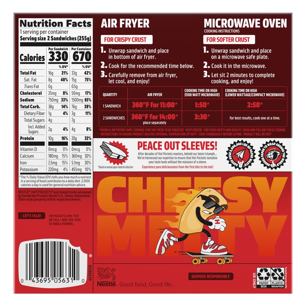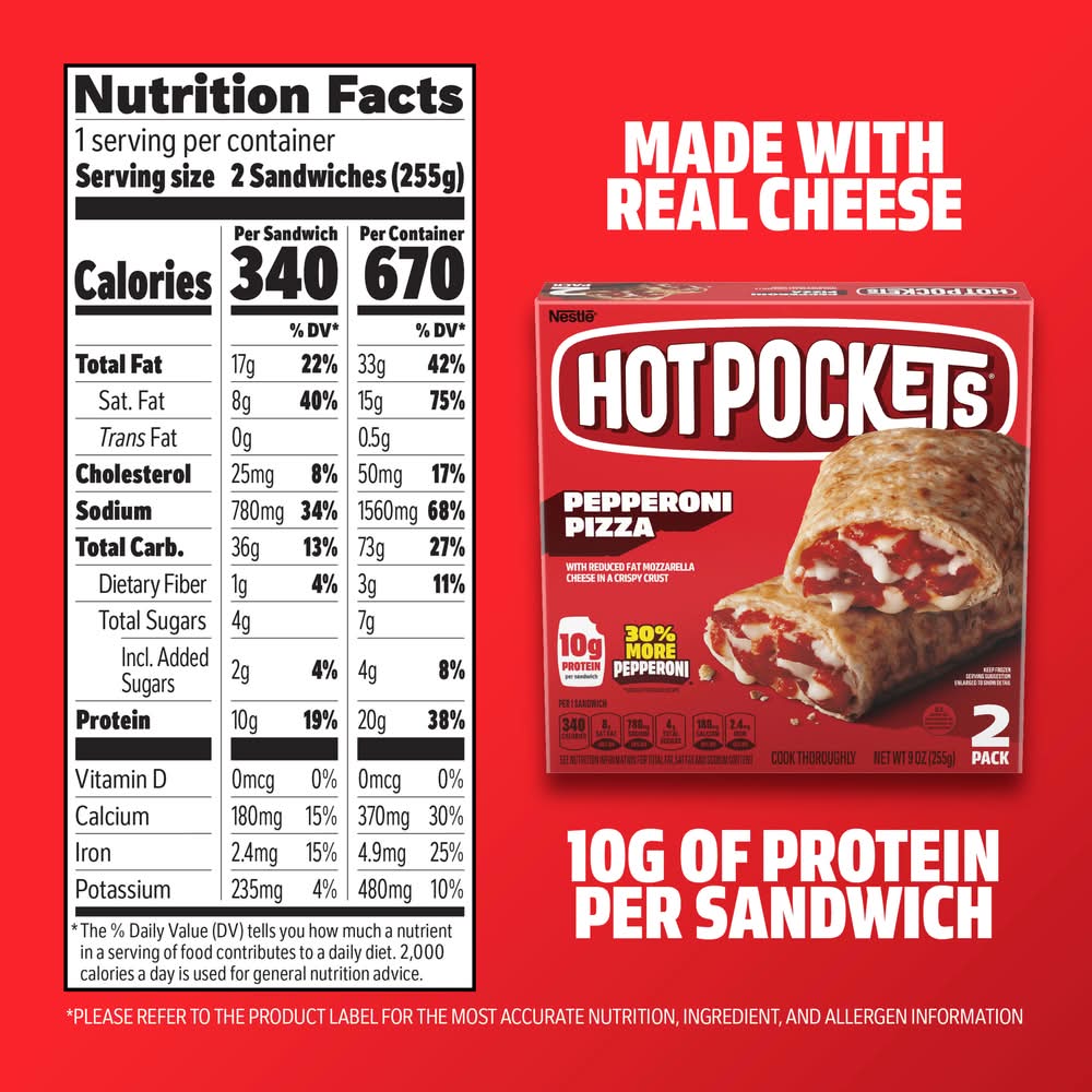 Dive into the cheesy, saucy and savory world of snacking with Hot Pockets Pepperoni Pizza frozen snacks. Our frozen sandwiches are loaded with premium pepperoni, along with reduced fat mozzarella cheese inside a delicious crispy crust. These indulgent pepperoni pizza Hot Pockets aren’t your average pizza rolls or frozen lunch snack. Hot Pockets sandwiches are hunger’s worst nightmare, delivering the bold flavors of pepperoni and cheese pizza in a hearty microwaveable snack. Great for gaming all night, a quick snack after school or a quick bite before heading out the door, Hot Pockets Pepperoni Pizza snacks are perfect for any occasion. Each frozen sandwich is a good source of protein with 10 grams per sandwich. Cook this microwave food for 1 minute, 50 seconds on high and let cool for 2 minutes for an on-the-go snack. Air fry at 360 degrees Fahrenheit for 16 minutes. Hot Pockets sandwiches are hot and delicious every time. Keep Hot Pockets Pepperoni Pizza sandwiches frozen until ready to cook and eat. Brand: Hot pockets
