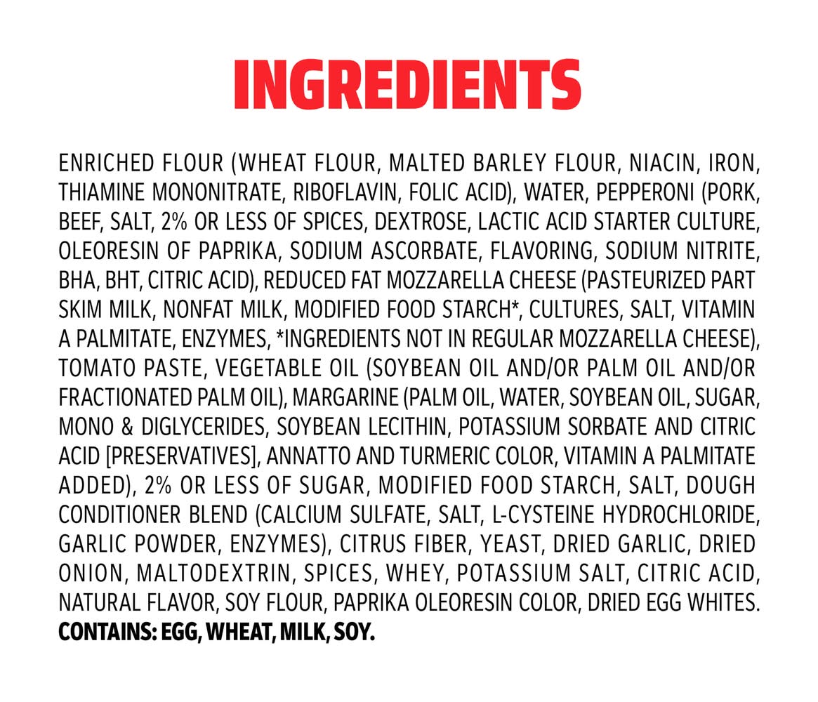Ingredients: ENRICHED FLOUR (WHEAT FLOUR, MALTED BARLEY FLOUR, NIACIN, IRON, THIAMINE MONONITRATE, RIBOFLAVIN, FOLIC ACID), WATER, PEPPERONI (PORK, BEEF, SALT, 2% OR LESS OF SPICES, DEXTROSE, LACTIC ACID STARTER CULTURE, OLEORESIN OF PAPRIKA, SODIUM ASCORBATE, FLAVORING, SODIUM NITRITE, BHA, BHT, CITRIC ACID), REDUCED FAT MOZZARELLA CHEESE (PASTEURIZED PART SKIM MILK, NONFAT MILK, MODIFIED FOOD STARCH*, CULTURES, SALT, VITAMIN A PALMITATE, ENZYMES, *INGREDIENTS NOT IN REGULAR MOZZARELLA CHEESE), TOMATO PASTE, VEGETABLE OIL (SOYBEAN OIL AND/OR PALM OIL AND/OR FRACTIONATED PALM OIL), MARGARINE (PALM OIL, WATER, SOYBEAN OIL, SUGAR, MONO DIGLYCERIDES, SOYBEAN LECITHIN, POTASSIUM SORBATE AND CITRIC ACID [PRESERVATIVES], ANNATTO AND TURMERIC COLOR, VITAMIN A PALMITATE ADDED), 2% OR LESS OF SUGAR, MODIFIED FOOD STARCH, SALT, DOUGH CONDITIONER BLEND (CALCIUM SULFATE, SALT, L-CYSTEINE HYDROCHLORIDE, GARLIC POWDER, ENZYMES), YEAST, CITRUS FIBER, DRIED GARLIC, DRIED ONION, MALTODEXTRIN, SPICES, WHEY, POTASSIUM SALT, CITRIC ACID, NATURAL FLAVOR, SOY FLOUR, PAPRIKA OLEORESIN COLOR, DRIED EGG WHITES. Contains: CONTAINS: EGG, WHEAT, MILK, SOY.