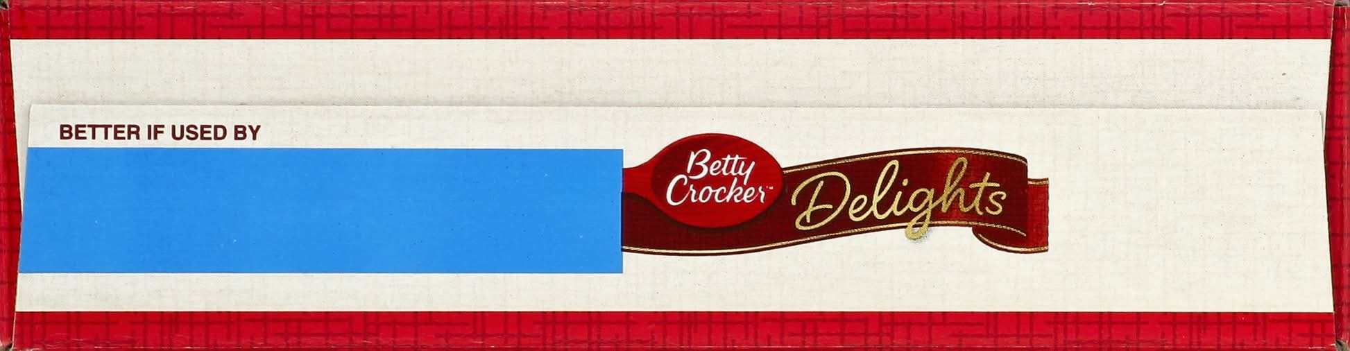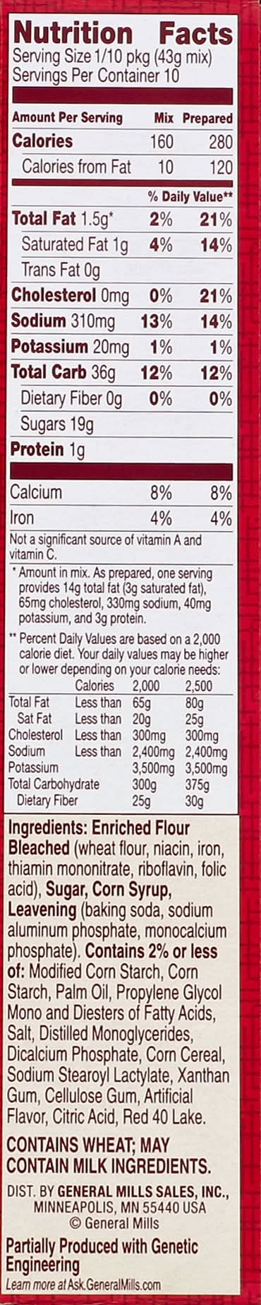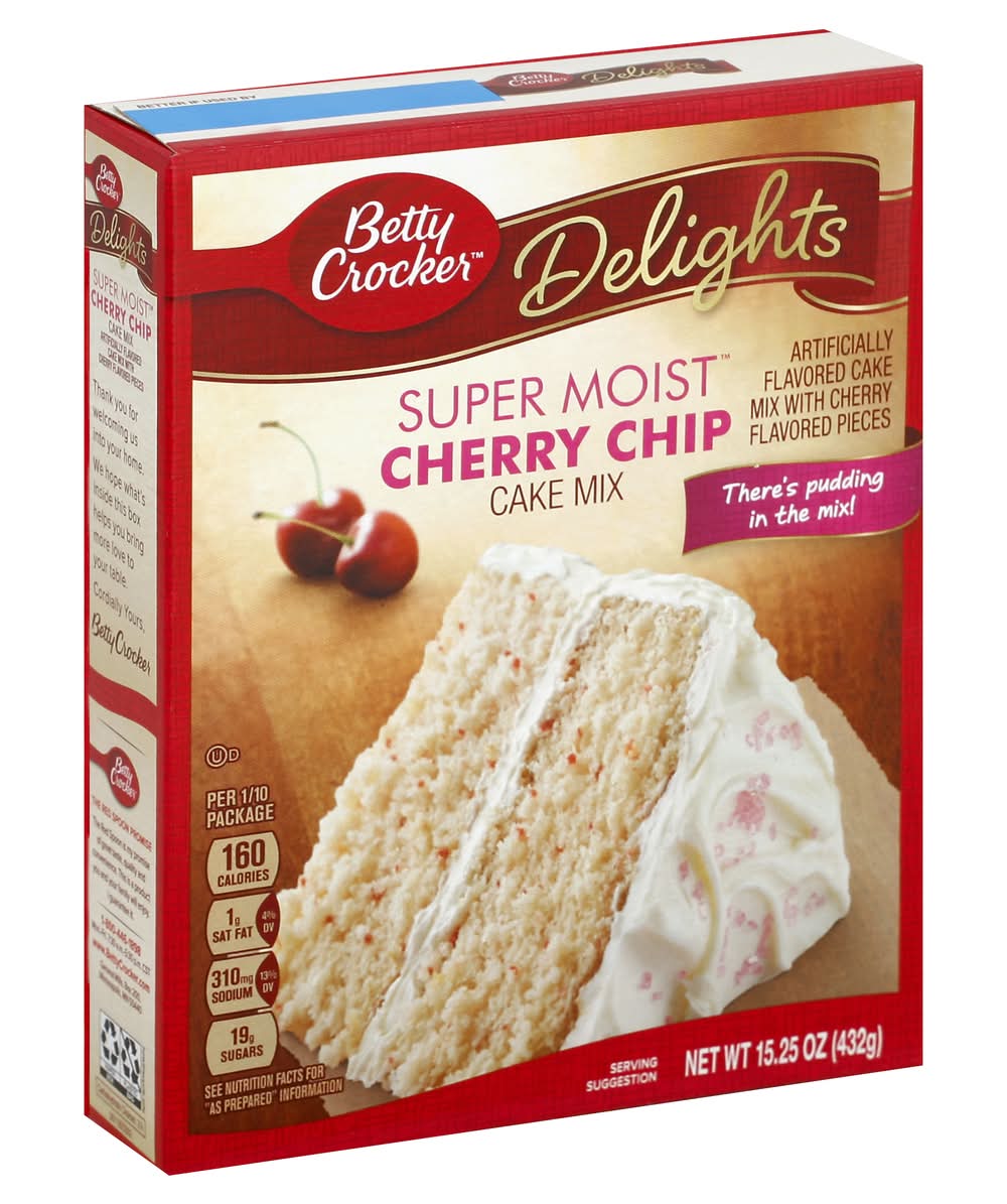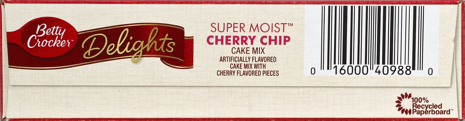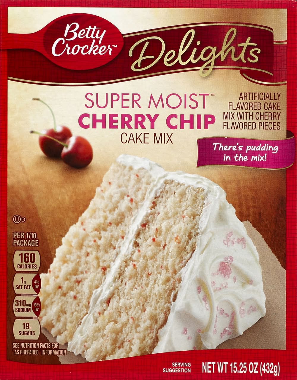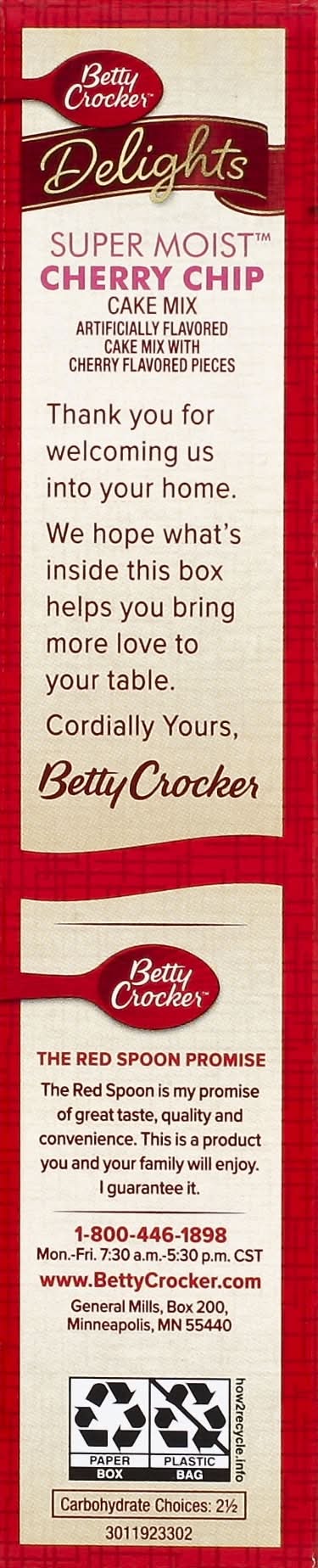 Artificially flavored cake mix with cherry flavored pieces. There's pudding in the mix! Per 1/10 Package: 160 calories; 1 g sat fat (4% DV); 310 mg sodium (13% DV); 19 g sugars. See nutrition facts for as prepared information. Make any day special with recipes and inspiration from BettyCrocker.com! Thank you for welcoming us into your home. We hope what's inside this box helps you bring more love to your table. Cordially yours, Betty Crocker. The Red Spoon Promise: The Red Spoon is my promise of great taste, quality and convenience. This is a product you and your family will enjoy. I guarantee it. 1-800-446-1898 Mon.-Fri. 7:30 a.m.-5:30 p.m. CST. www.BettyCrocker.com. General Mills, Box 200, Minneapolis, MN 55440. how2recycle.info. Partially produced with genetic engineering. Learn more at Ask.GeneralMills.com. 100% recycled paperboard. Carbohydrate Choices: 2-1/2. • Brand: Betty crocker • kosher • General Mills Sales, Inc., Minneapolis, MN, 55440 • Packaging: Reusable