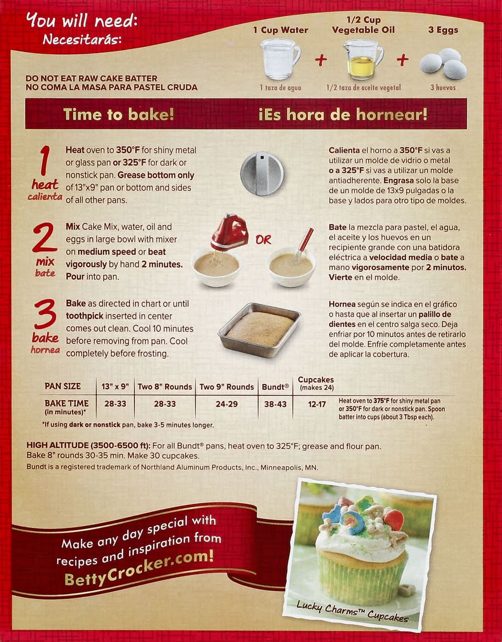 You will need: 1 cup water. 1/2 cup vegetable oil. 3 eggs. do not eat raw cake batter. bake: time to bake! (1) heat: heat oven to 350 degrees f for shiny metal or glass pan or 325 degrees f for nonstick pan. grease bottom only of 13 in. x 9 in. pan or bottom and sides of all other pans. (2) mix: mix cake mix, water, oil and eggs in large bowl with mixer on medium speed or beat vigorously by hand 2 minutes. pour into pan. (3) bake: bake as directed in chart or until toothpick inserted in center comes out clean. cool 10 minutes before removing from pan. cool completely before frosting. pan size: 13 in. x 9 in., bake time (in minutes): 28-33; pan size: two 8 in. rounds, bake time (in minutes): 28-33; pan size: two 9 in. rounds, bake time (in minutes): 24-29; pan size: bundt, bake time (in minutes): 38-43; pan size: cupcakes (makes 24), bake time (in minutes): 12-17. heat oven to 375 degrees for shiny metal pan or 350 degrees f for nonstick pan. spoon batter into cups (about 3 tbsp each). high altitude (3500-6500 ft): for all bundt pans, heat oven to 325 degrees f; grease and flour pan. bake 8 in rounds 30-35 min. make 30 cupcakes.