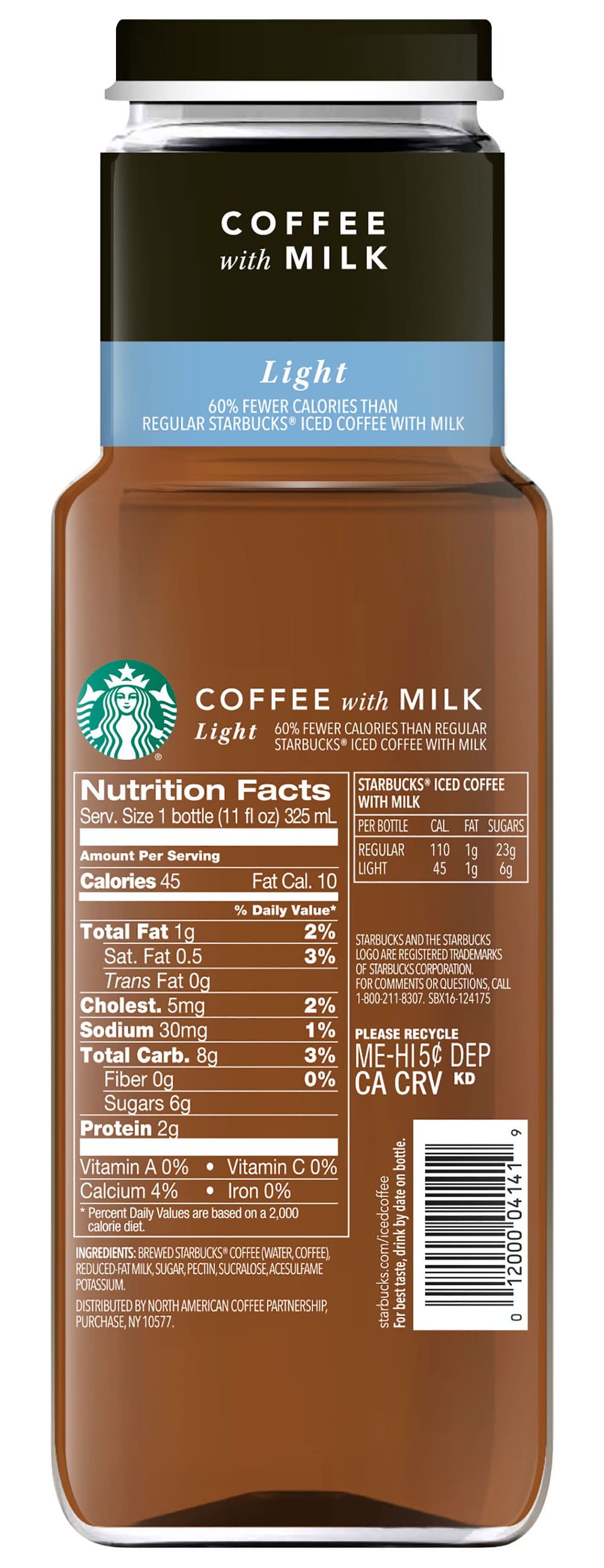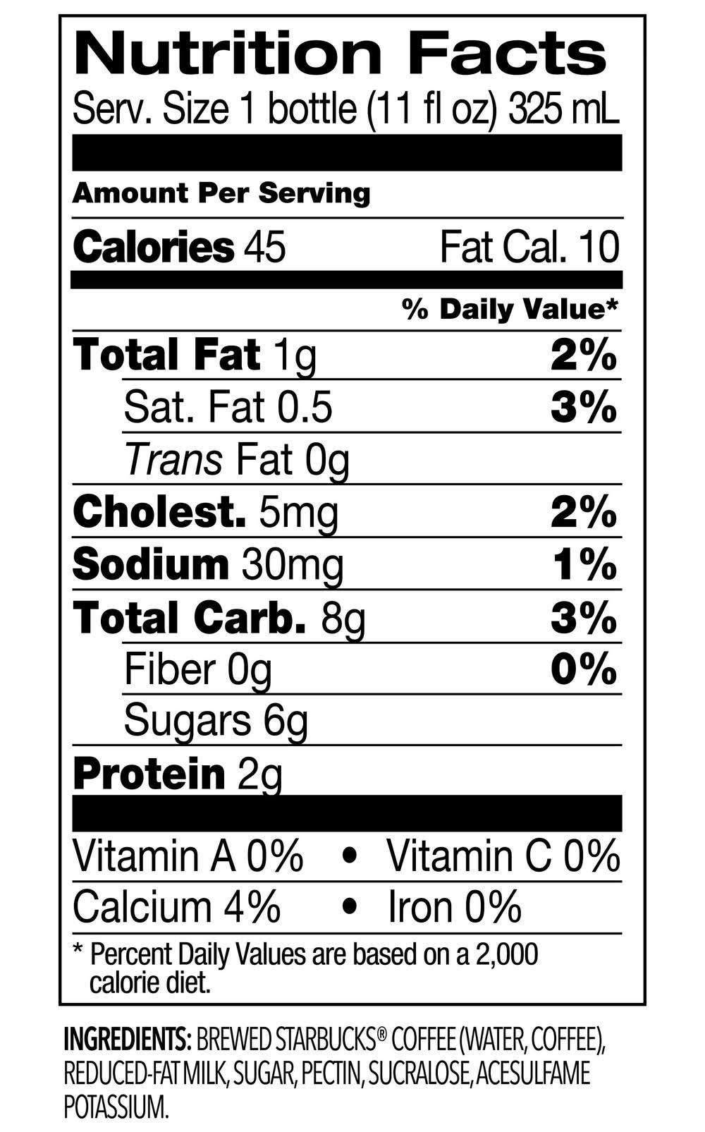 Ingredients: Brewed Starbucks Coffee (Water, Coffee), Reduced-Fat Milk, Sugar, Pectin, Sucralose, Acesulfame Potassium. Contains: Milk
