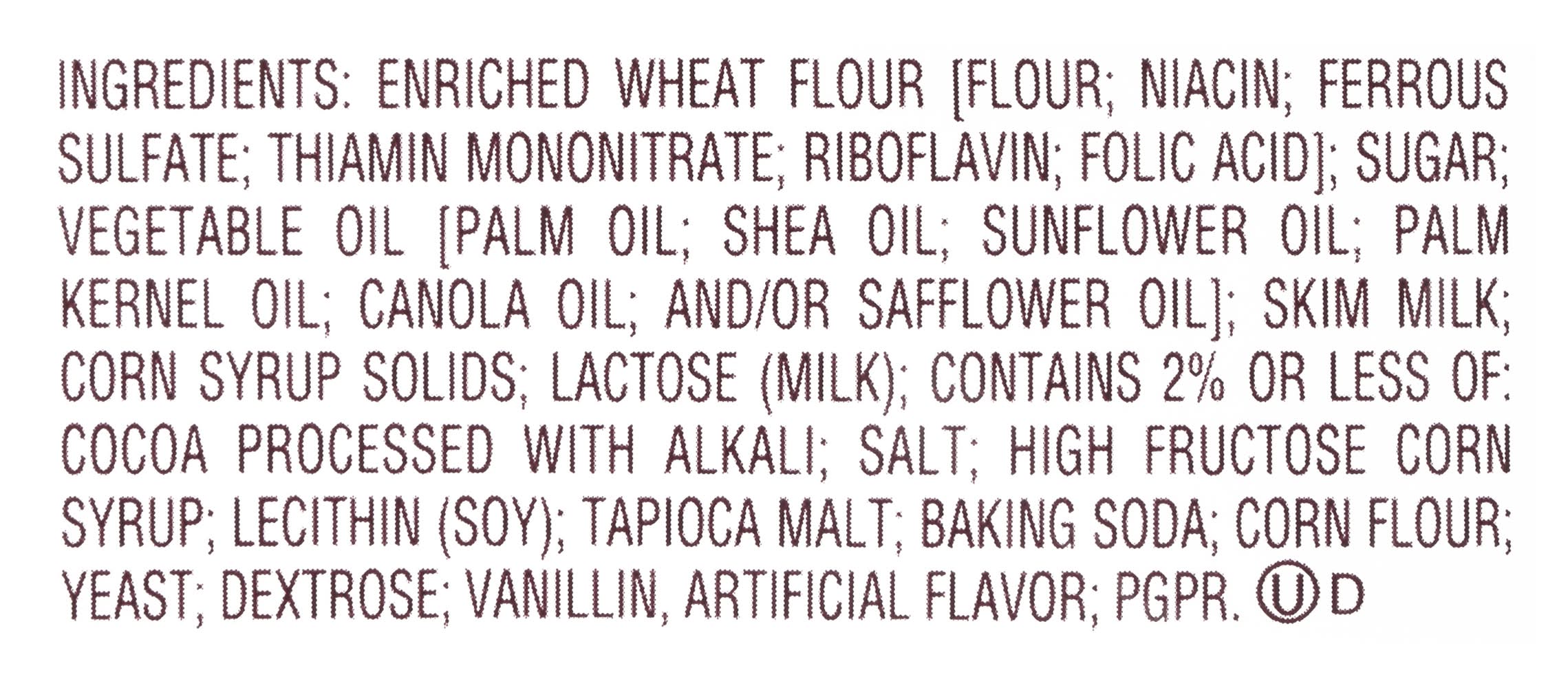 Ingredients: Enriched Wheat Flour [Flour; Niacin; Ferrous Sulfate; Thiamin Mononitrate; Riboflavin; Folic Acid]; Sugar;, Vegetable Oil [Palm Oil; Shea Oil; Sunflower Oil; Palm Kernel Oil; Cano, Artificial Flavor; PGPR Contains: Wheat, Milk, Soybeans, Lactose, Tree Nuts, Peanuts, Tree Nuts