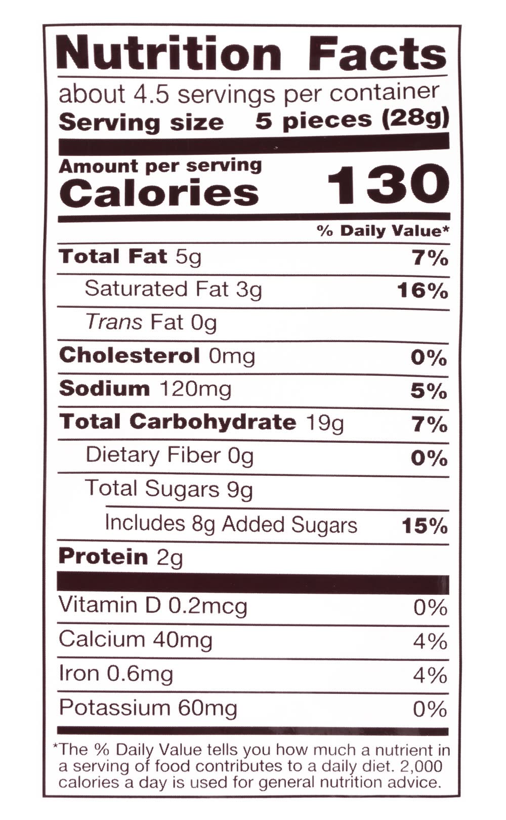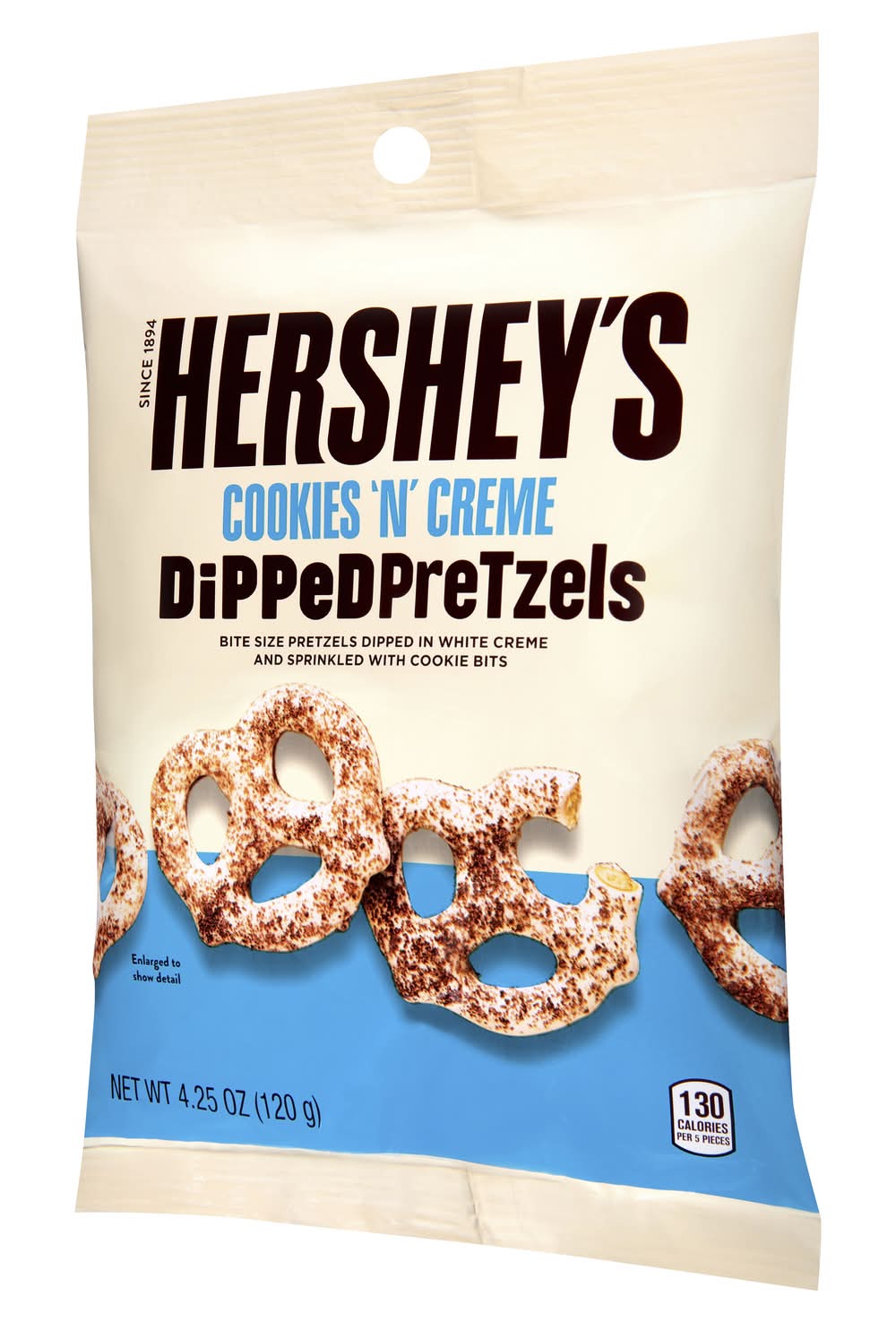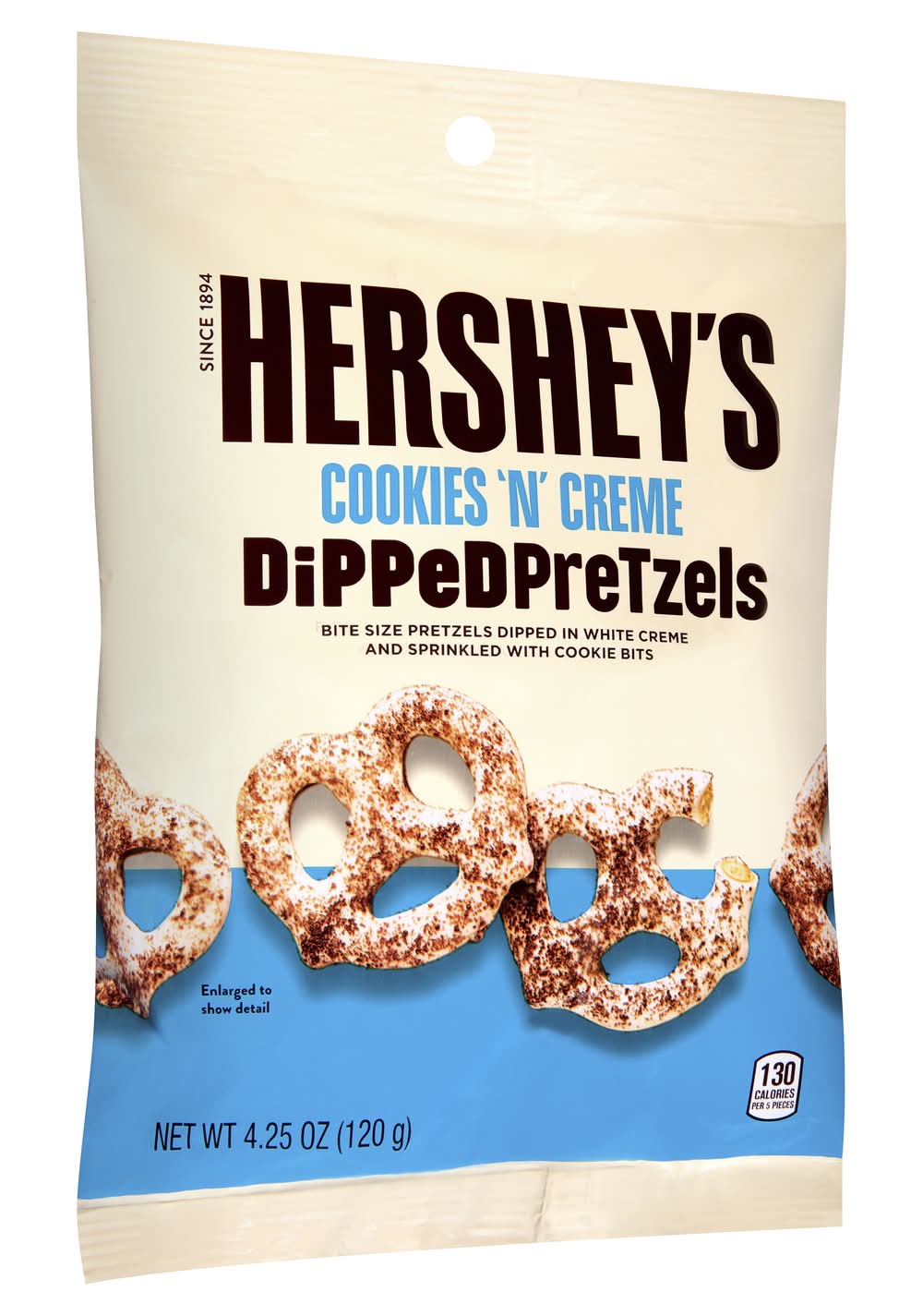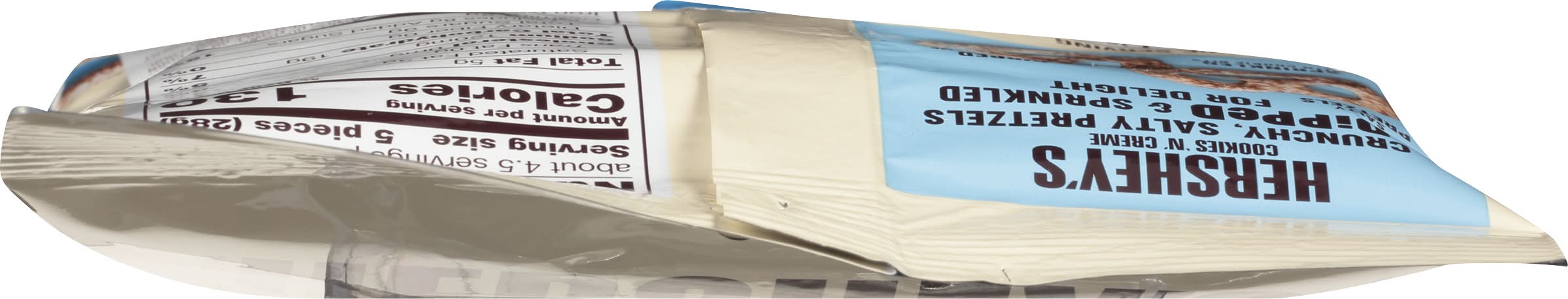 Bite size pretzels dipped in white creme and sprinkled with cookie bits. 130 calories per 5 pieces. Per 5 Piece Serving: 130 calories; 3 g sat fat (16% DV); 120 mg sodium (5% DV); 9 g total sugars. Since 1984. Crunchy, salty pretzels. Dipped & Sprinkle for delight. • Number of servings: 4 • Hershey, Hershey, PA