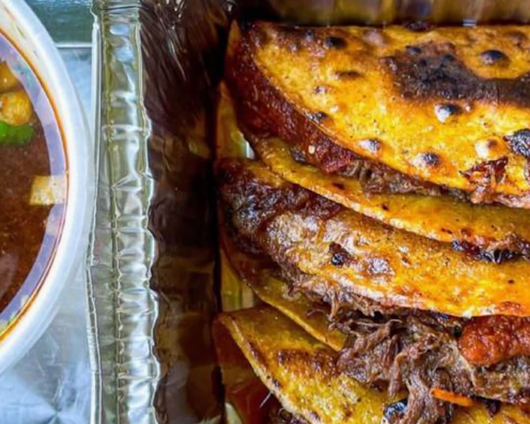 Flour tortillas, choice of protein (birria, chicken, carne asada), rice, beans, crema, salsa, lime, tq salsaTacos