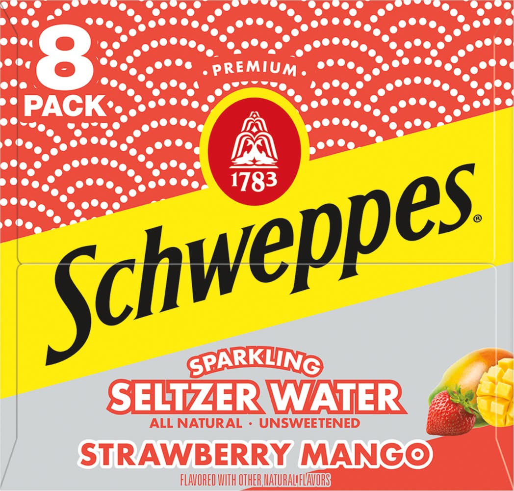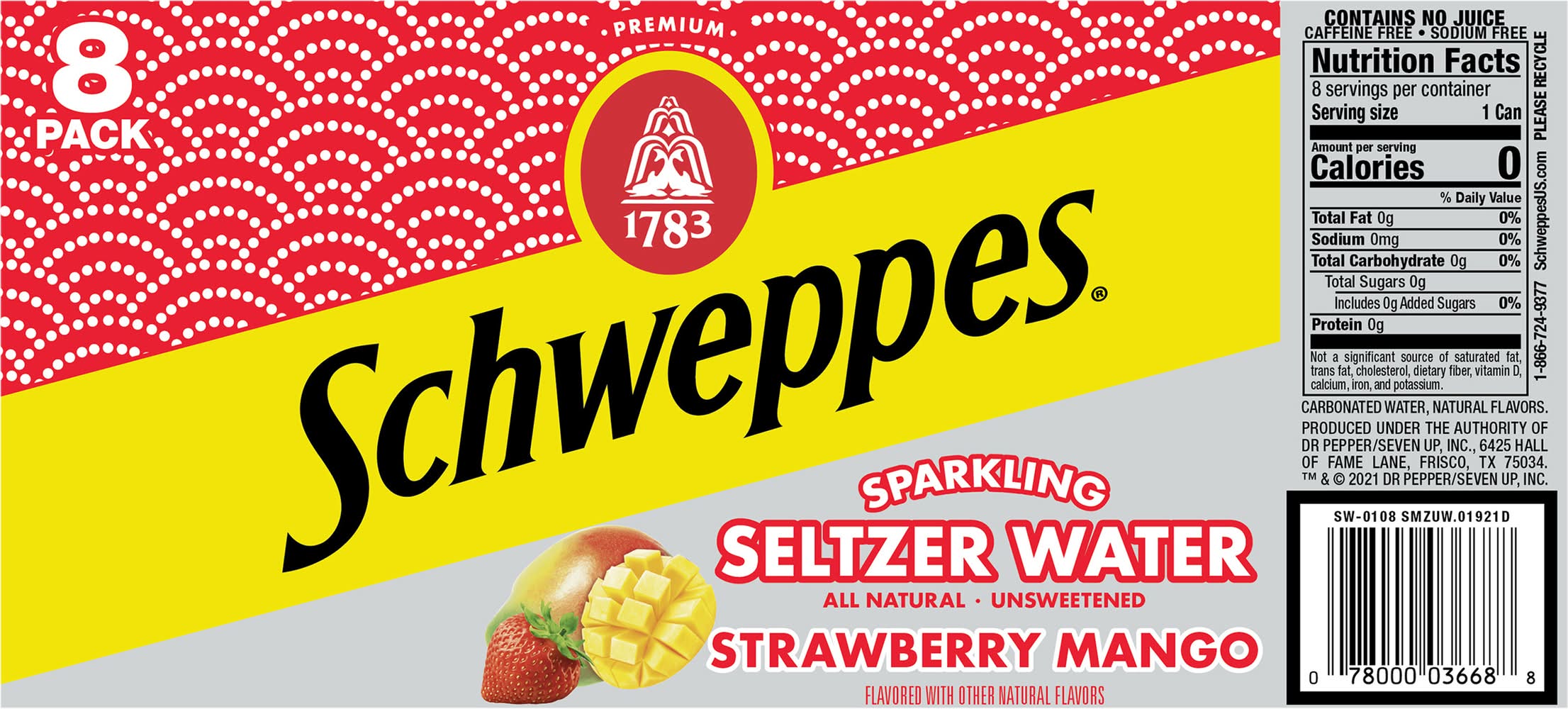 Seltzer Water, Sparkling, Strawberry Mango, 8 Pack • Pack size: 8 • Number of servings: 8 • Dr Pepper/Seven Up, Inc., Frisco, TX, 75034, Ph: 866-724-9377