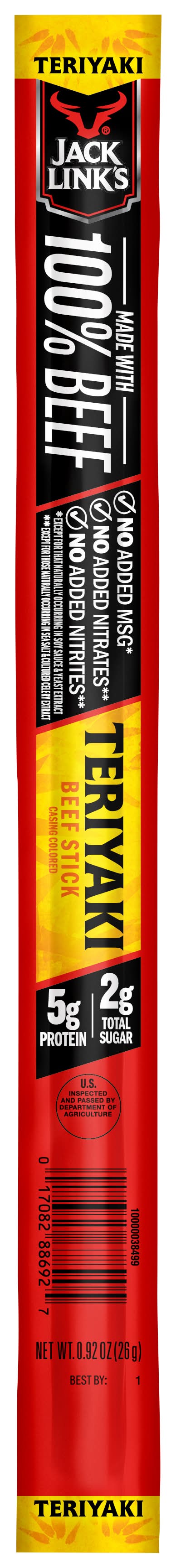 Savor the bold and savory flavor of Jack Links Teriyaki Beef Stick, a convenient snack with 5 grams of protein and only 2 grams of total sugar per serving. Crafted without added MSG, except for the amounts naturally found in soy sauce and yeast extract, and free from added nitrates or nitrites, with the exception of those naturally present in sea salt and cultured celery extract. Each beef stick is encased in a colored casing and has been inspected and approved by the U.S. Department of Agriculture to ensure quality and safety.
