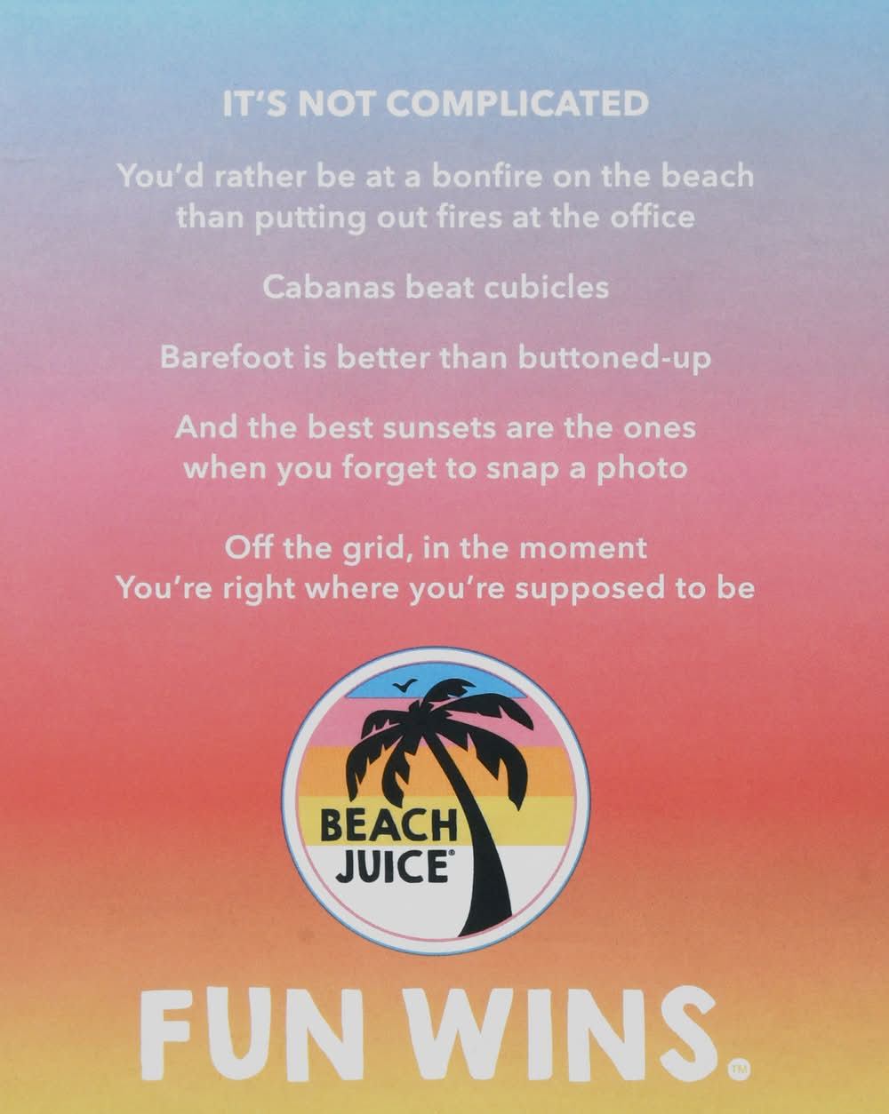 4 x 250 ml cans = 1 L = 1 1/3 (750 ml) bottles. It's not complicated. You'd rather be at a bonfire on the beach than putting out fires at the office. Cabanas beat cubicles. Barefoot is better than buttoned-up. And the best sunsets are the ones when you forget to snap a photo. Off the grid, in the moment. You're right where you're supposed to be. Fun wins. 13% alc/vol. 26 Vinted and canned by Beach Juice Co. San Miguel, CA. • Pack size: 4 • Alcohol by volume: 13%