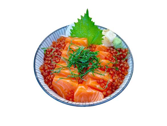 Salmon sashimi, salmon roe, shiso mint, and zuke sauce