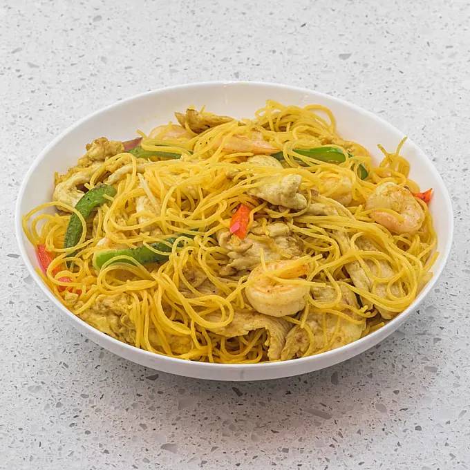 (shellfish) perfect balanced flavor bomb of Singapore-style curry stir-fried rice vermicelli, with scrambled eggs, onions, peppers, chicken, and shrimp.