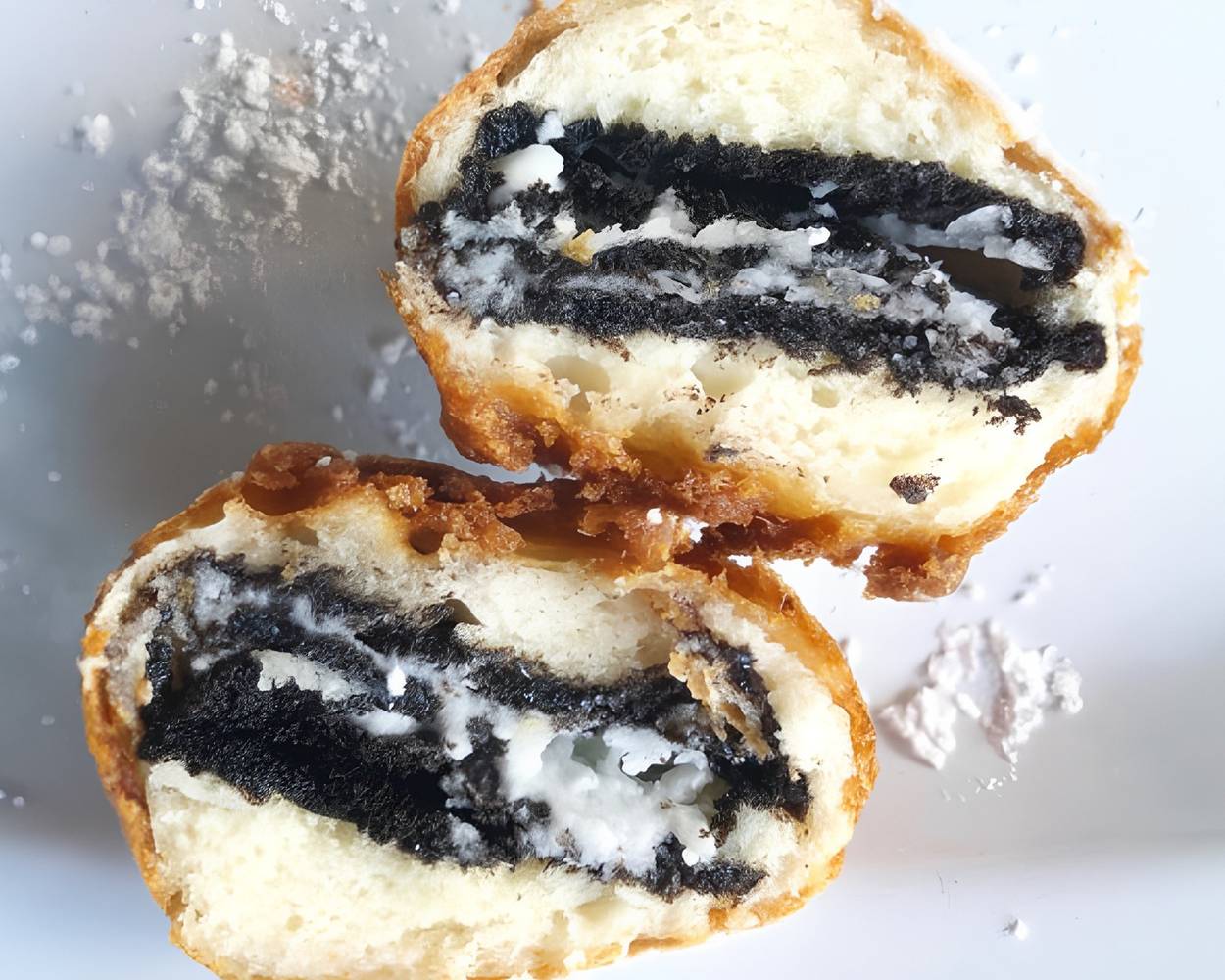 Four double stuff Oreo cookies battered and fried, topped with powdered sugar and a side of chocolate.