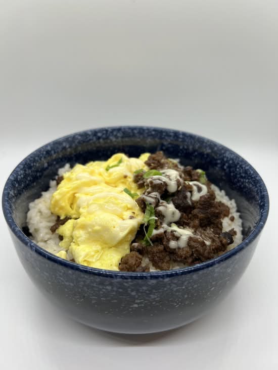 Tteokgalbi served with scrambled egg, white rice, green onion, mango mayo.