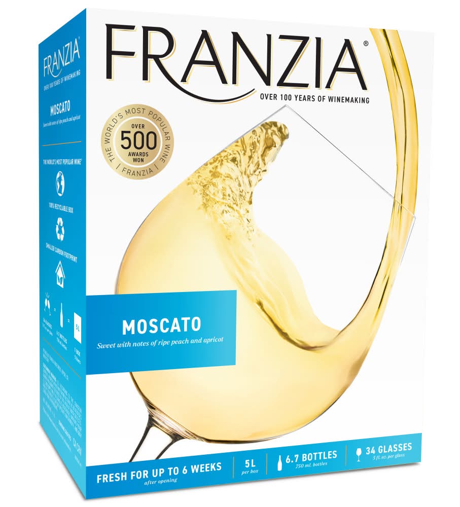 Franzia Moscato white wine is made from a delightful blend of sweet Moscato grapes, offering a light-bodied experience. This American varietal tantalizes the palate with delicate aromas of juicy peach and flavors of white apricot, and features a 10% ABV. It pairs beautifully with spicy foods like Chinese cuisine, and is perfect for a warm summer afternoon or sharing with friends. Honored with 92 points and a gold medal from the Sunset International Wine Competition in 2021, making it ideal for social gatherings or intimate dinners. • Alcohol by volume: 10% • Franzia Vineyards, Ripon, CA • Packaging: Reusable