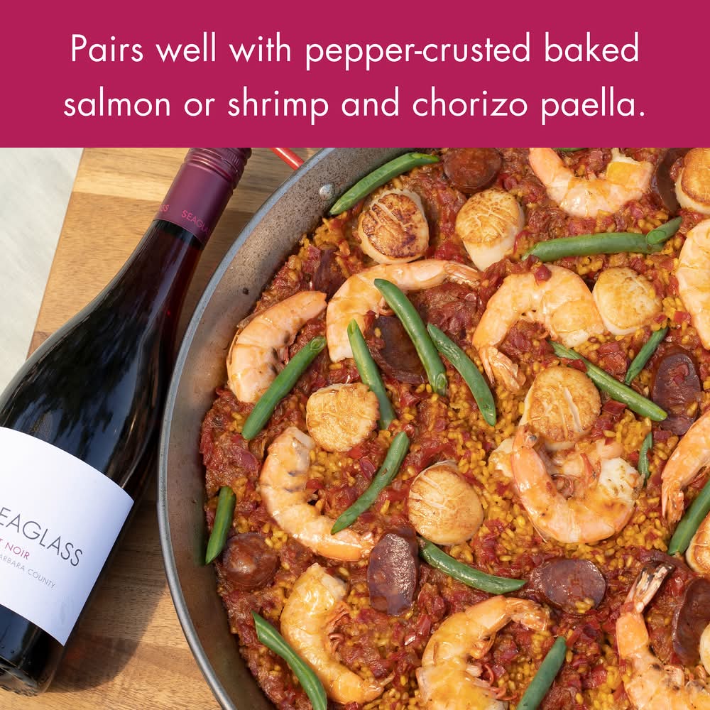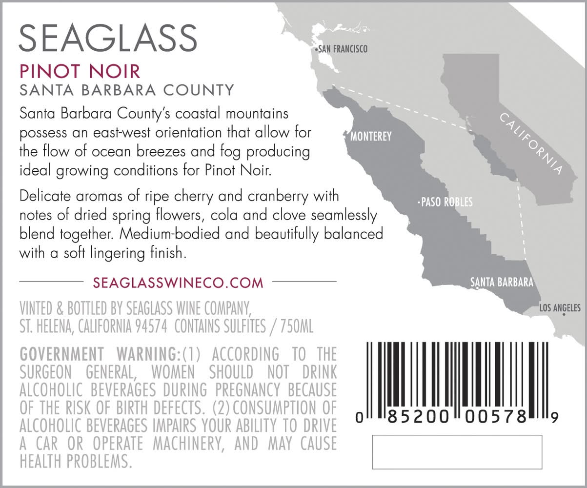 With its elegant style, SEAGLASS Pinot Noir Red Wine is a quintessential expression of Santa Barbara County’s cool-climate vines. A delicate, perfumed Pinot Noir, this dry red wine features a palate of bright red cherry and strawberry that's medium bodied with a soft, lingering finish. The 2018 vintage received 90 Points from the Tasting Panel in the July/August 2021 issue. Beautifully balanced with vibrant acidity, this red wine is the ideal complement for grilled salmon, lamb and earthy mushrooms. Sourced from SEAGLASS' home vineyard in Los Alamos, California, which is comprised almost entirely of sand, the soil heats up quickly, giving the grapes more time to develop. A minimalist approach to wine making preserves the fresh, bright character of the fruit from vineyard to bottle. The wine is aged in small oak tanks, creating the perfect balance of delicate varietal flavor, crisp acidity and nuanced oak notes in this coastal Pinot Noir red wine. This bottled wine is 14% alcohol by volume. SEAGLASS wines offer a rewarding discovery of high quality, fresh, bright flavorful wines with a casual yet sophisticated take on California’s Central Coast wine growing region. SEAGLASS wines offer a rewarding discovery of high quality, fresh, bright flavorful wines with a casual yet sophisticated take on California’s Central Coast wine growing region. • Alcohol by volume: 13.5% • Seaglass Wine, Napa, CA 94589