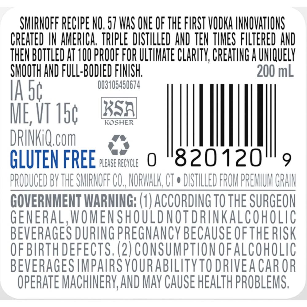 Impress guests at your next cocktail party with the unrivaled smoothness of Smirnoff 100 Proof Vodka. Each batch is made from premium grain, is Kosher Certified, triple distilled, and 10 times filtered to ensure a smooth yet complex finish. This gluten-free vodka is ideal on the rocks or mixed with your favorite beverage for silky, full-bodied cocktails. From the classic Moscow Mule with ginger beer and lime, to your go-to martini, or a robust Bloody Mary, this vodka is premium, diverse, and memorable. Includes one 200 mL bottle of Smirnoff 100 Proof Vodka. Please enjoy responsibly. • Alcohol by volume: 50% • Packaging: Reusable
