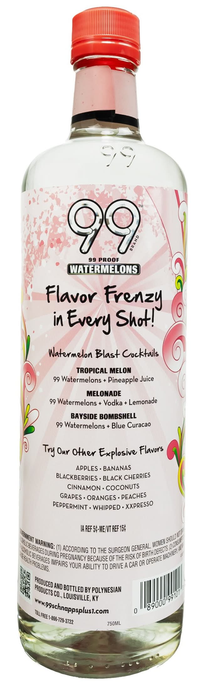 Liven up your experience with the exciting flavor of 99 Brand Watermelon Liqueur. With 27 cordials flavors and growing, 99 is America's #1 cordials brand. These liqueur shots are an amazing way to celebrate the good times and chill vibes. Each bottle of 99 Brand Watermelon liqueur drinks has zero sugar and 155 calories per 1.5 ounce shot. At 49.5% alcohol, 99 can be enjoyed straight out of the bottle as shots for a burst of tasty watermelon flavor. Perfect for any party or celebration with friends, 99 Watermelons tastes great in a multitude of spectacular alcoholic beverages, cocktails and mixed drinks. Add a splash to your seltzer for a full flavor explosion or combine this watermelon liqueur shot with other 99 Brand liqueurs, like 99 Blackberries, to make a variety of delicious alcoholic beverages. Store 99 Watermelons at room temperature or pour it from your freezer for an icy shot. Live life in color with 99 Brand Liqueur. Please drink responsibly. Alcohol by volume: 49.5%