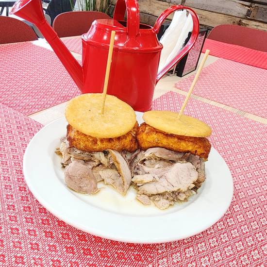 2 AREPITAS DE MAIZ PILAO, RELLENAS DE PERNIL REBANADO Y QUESO FRITO BANADAS CON EL JUGO DEL PERNIL.