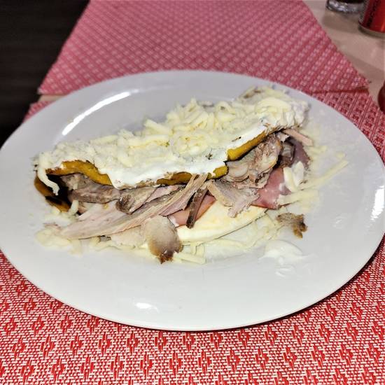 PANQUEQUE DE MAÍZ DULCE CON JAMÓN AHUMADO, QUESO DE MANO, PERNIL, SERVIDO CON NATA, QUESO MOZZARELLA Y QUESO PARMESANO DE TOPPING.