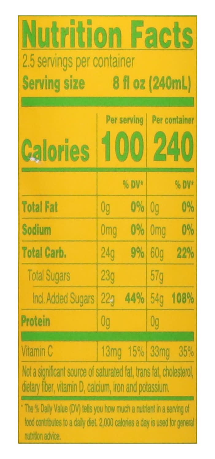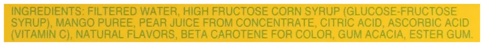 Ingredients: Filtered Water, High Fructose Corn Syrup (Glucose Fructose Syrup), Mango Puree, Pear Juice from Concentrate, Citric Acid, Ascorbic Acid (Vitamin C), Natural Flavors, Beta Carotene for Color, Gum Acacia, Ester Gum Contains: Corn