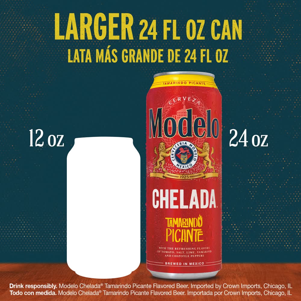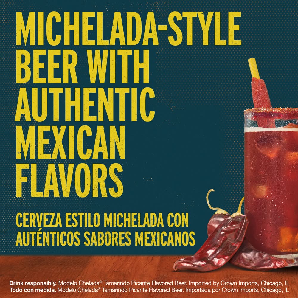 A michelada-style beer, Modelo Chelada Tamarindo Picante Mexican Import Flavored Beer combines the sweet rush of tamarind with the spice of chipotle peppers, bringing to life the vibrancy of Mexico in this unique take on a traditional michelada. Crafted with Modelo beer and the classic flavors of tomato, salt, and lime, this authentic Mexican beer is delicious and well-balanced. Served in ready-to-drink, 24 oz single beer cans, this chelada beer has 139 calories* per 12 oz serving, or 278 calories per 24 oz can. A cerveza with refreshing taste and authenticity, this michelada beer embodies the lively Mexican spirit. This Modelo chelada beer offers a fun, invigorating flavor experience, making it a great way to kickstart the evening or the weekend. *Per 12 fl. oz. serving of average analysis: Calories 139, Carbs 18.0 grams, Protein 1.3 grams, Fat 0 grams. Drink responsibly. Modelo Chelada® Tamarindo Picante Flavored Beer. Imported by Crown Imports, Chicago, IL • Brand: Modelo • Category: Fruit beer • Alcohol by volume: 3.2% • Crown imports, Chicago,IL • Packaging: Reusable