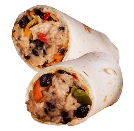 Grilled chicken, peppers, and onions wrapped in a soft flour tortilla.