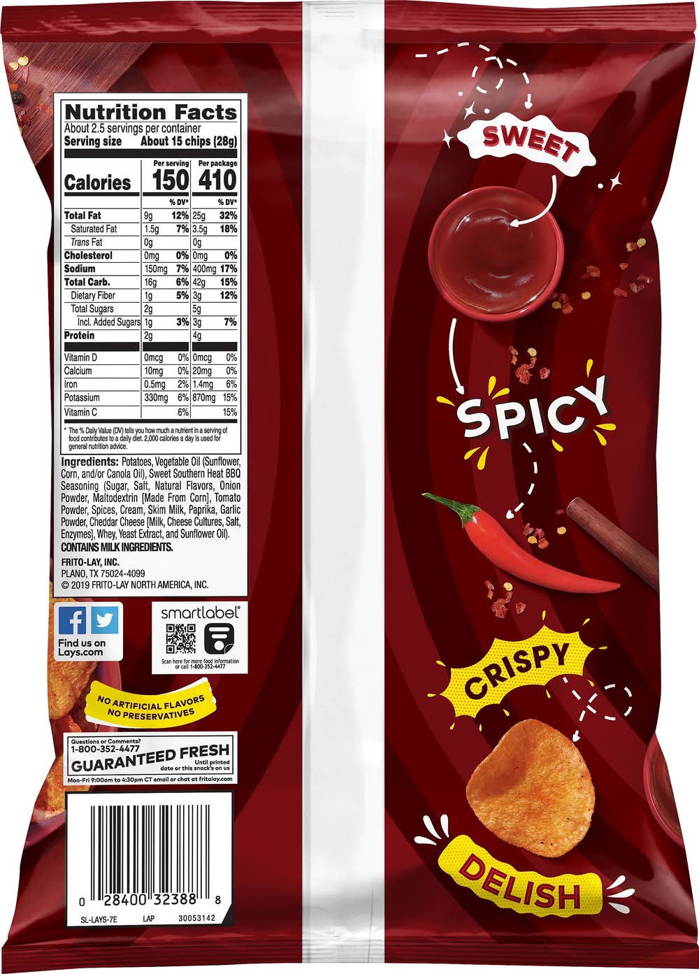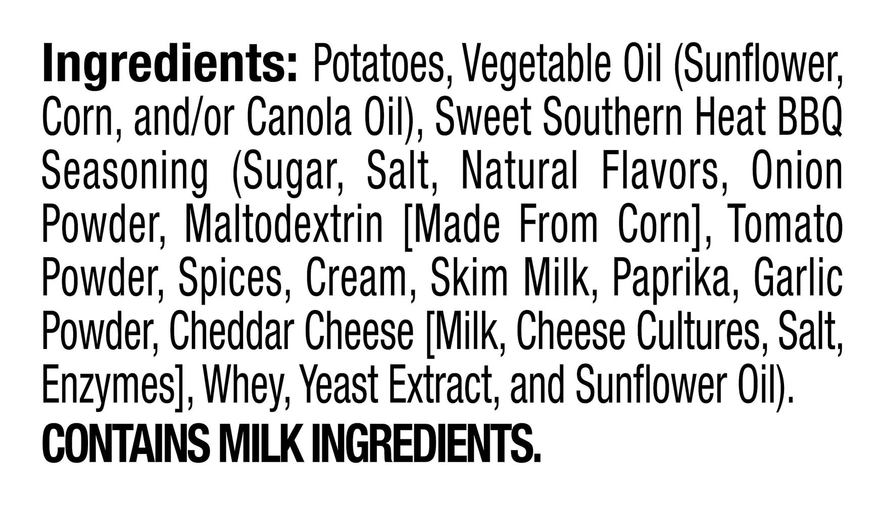 Ingredients: Potatoes, Vegetable Oil (Sunflower, Corn, and/or Canola Oil), Sweet Southern Heat Bbq Seasoning (Sugar, Salt, Natural Flavors, Onion Powder, Maltodextrin [Made from Corn], Tomato Powder, Spices, Cream, Skim Milk, Paprika, Garlic Powder, Cheddar Cheese [Milk, Cheese Cultures, Salt, Enzymes], Whey, Yeast Extract, and Sunflower Oil) Contains: Milk