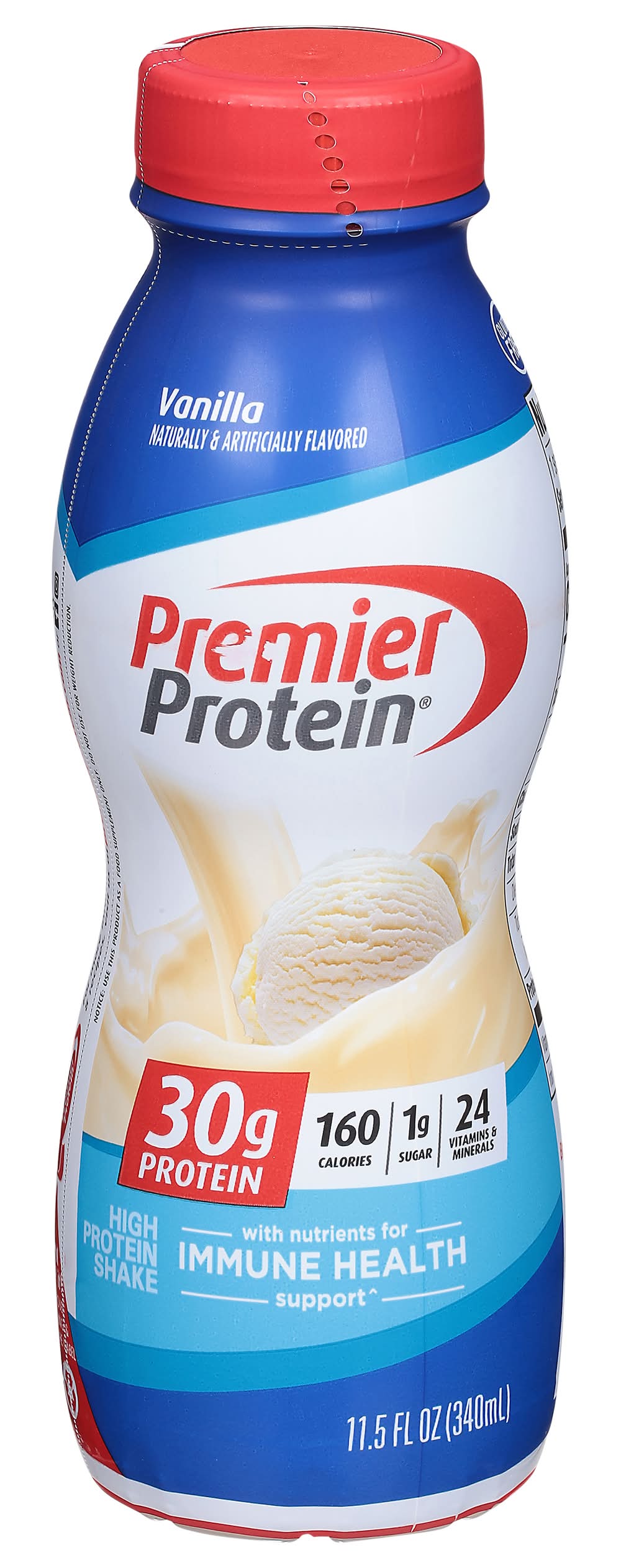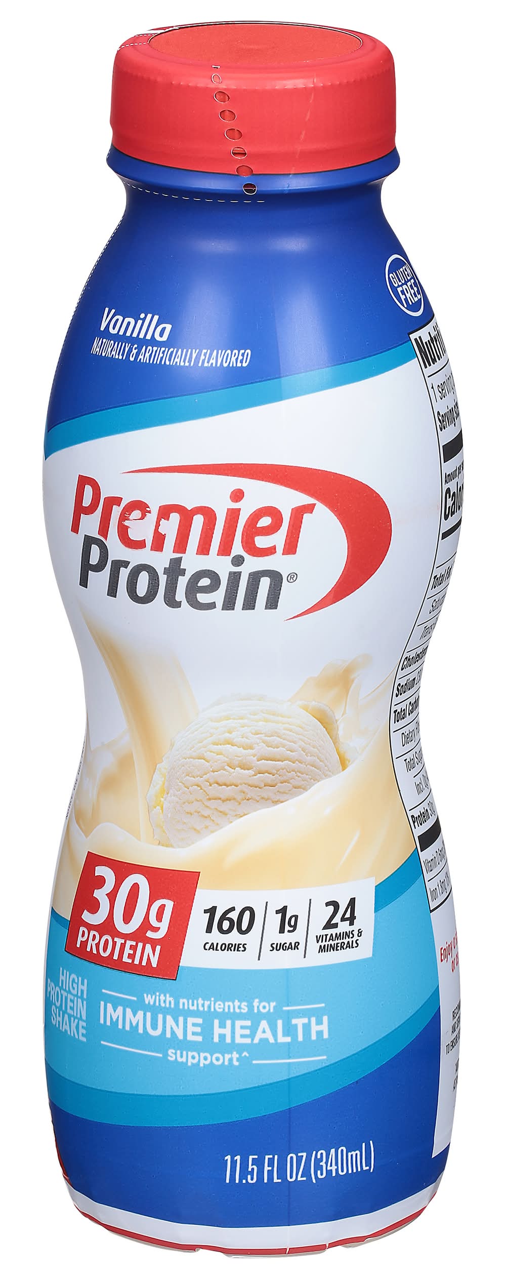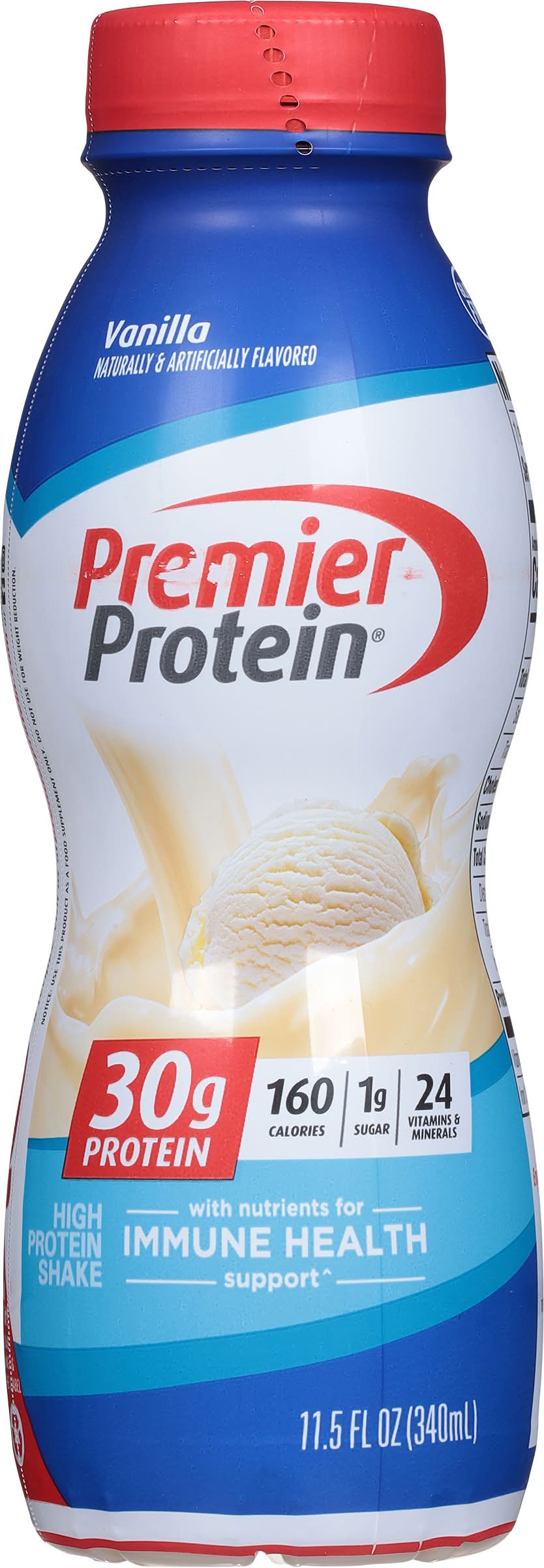 Protein Shake provides a nourishing blend of 30 grams of protein, 160 calories, 1 gram of sugar, and 24 vitamins and minerals. With a low-fat content, this gluten-free shake is suitable as a morning beverage or a wholesome snack. It is made in the USA using both domestic and imported ingredients. • Flavor: Vanilla • Premier Nutrition Corporation, Emeryville, CA, 94608