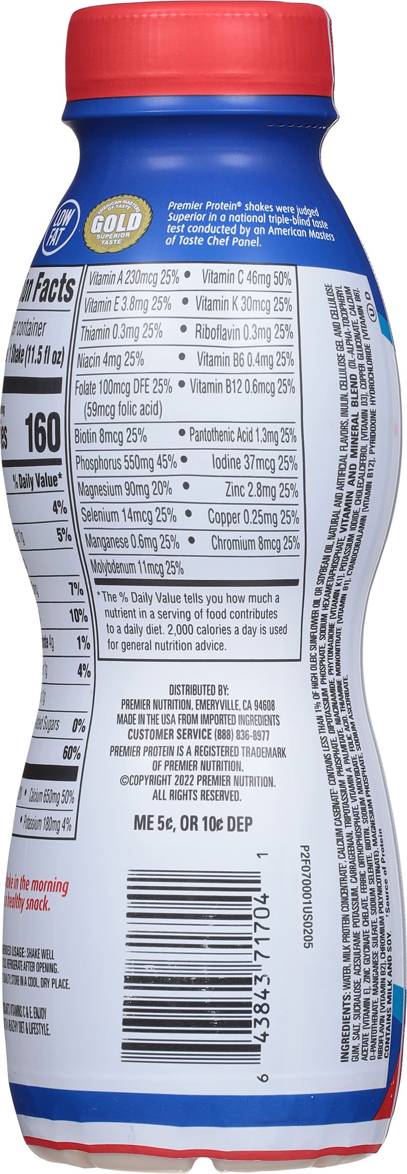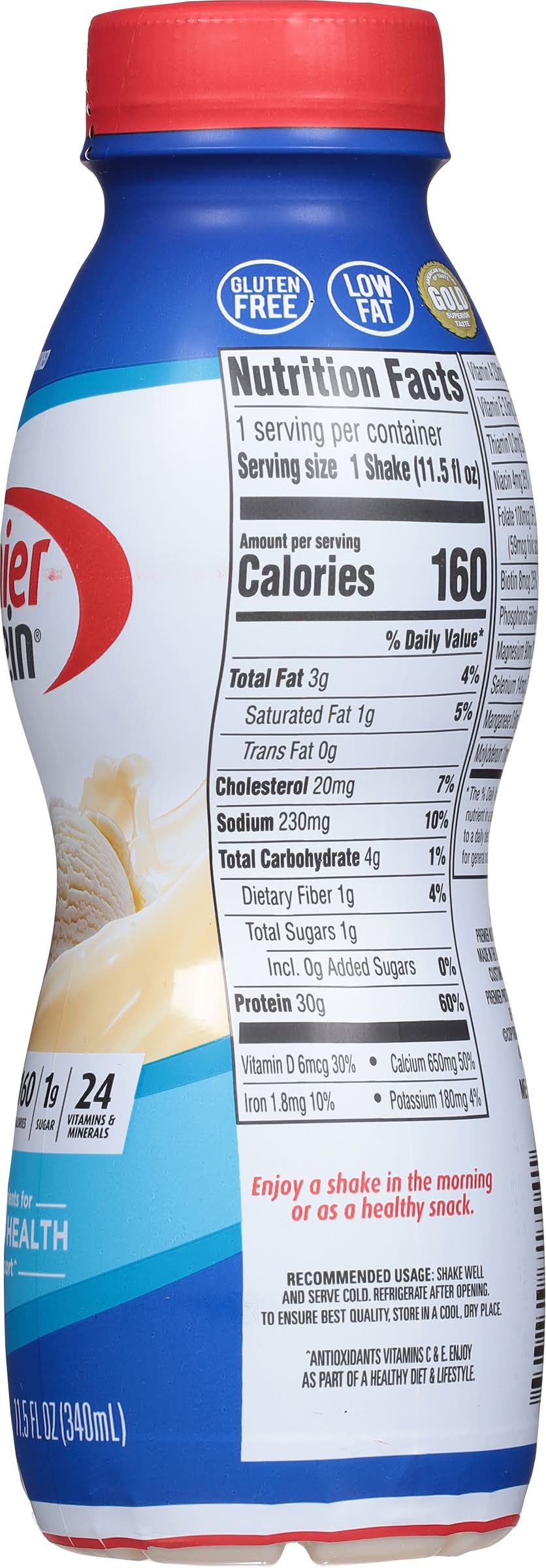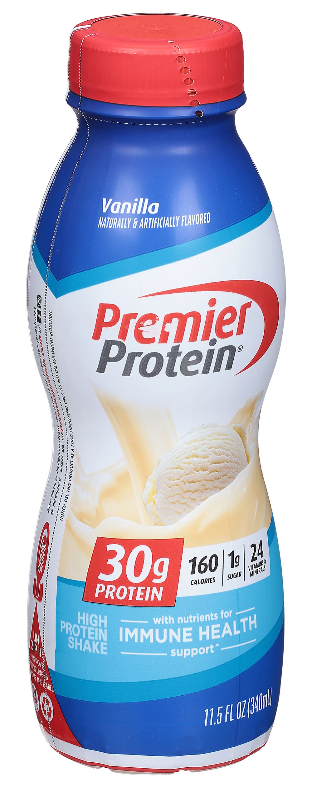 Protein Shake provides a nourishing blend of 30 grams of protein, 160 calories, 1 gram of sugar, and 24 vitamins and minerals. With a low-fat content, this gluten-free shake is suitable as a morning beverage or a wholesome snack. It is made in the USA using both domestic and imported ingredients. • Flavor: Vanilla • Premier Nutrition Corporation, Emeryville, CA, 94608