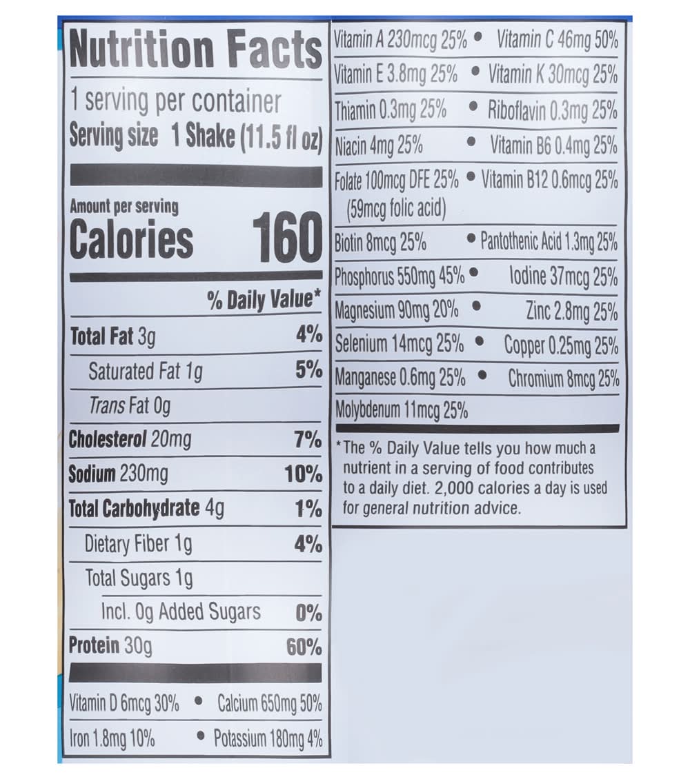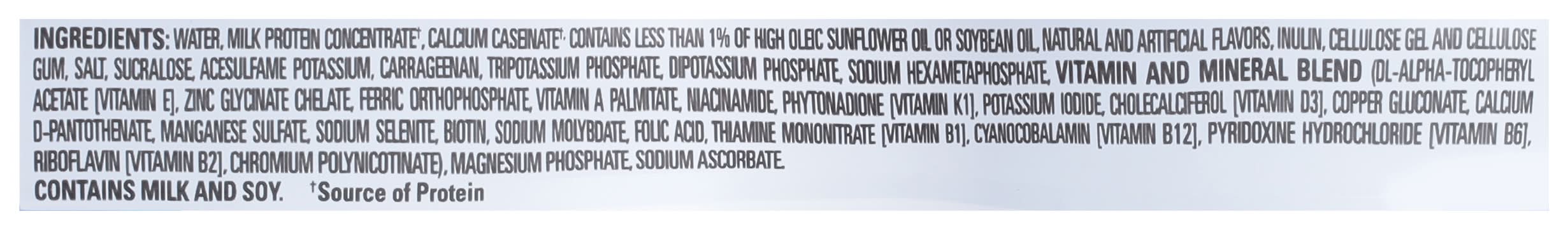 Ingredients: Water, Milk Protein Concentrate(a), Calcium Caseinate(a), Contains Less than 1% of High Oleic Sunflower Oil or Soybean Oil, Natural and Artificial Flavors, Inulin, Cellulose Gel and Cellulose Gum, Salt, Sucralose, Acesulfame Potassium, Carrageenan, Tripotassium Phosphate, Dipotassium Phosphate, Sodium Hexametaphosphate, Vitamin and Mineral Blend (DL-Alpha-Tocopheryl Acetate [Vitamin E], Zinc Glycinate Chelate, Ferric Orthophosphate, Vitamin A Palmitate, Niacinamide, Phytonadione [Vitamin K1], Potassium Iodide, Cholecalciferol [Vitamin D3], Copper Gluconate, Calcium D-Pantothenate, Manganese Sulfate, Sodium Selenite, Biotin, Sodium Molybdate, Folic Acid, Thiamine Mononitrate [Vitamin B1), Cyanocobalamin [Vitamin B12], Pyridoxine Hydrochloride (Vitamin B6], Riboflavin (Vitamin B2], Chromium Polynicotinate), Magnesium Phosphate, Sodium Ascorbate. (a) Source of Protein Contains: Milk, Soybeans