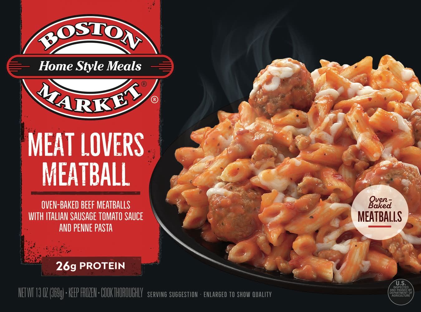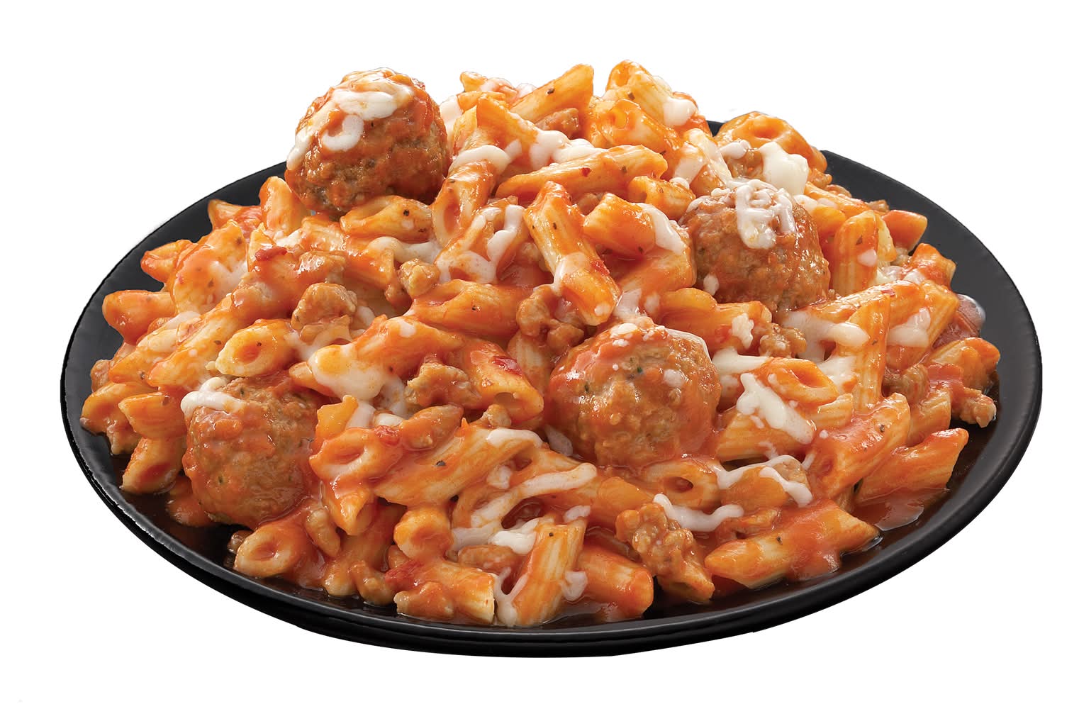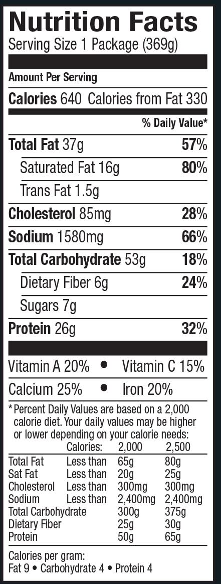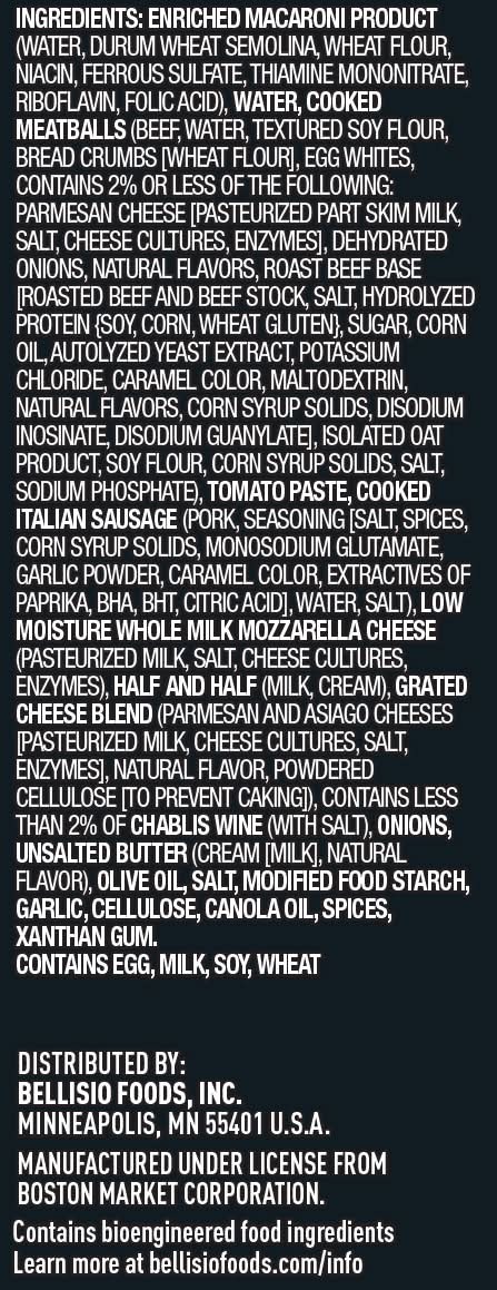 Ingredients: Enriched Macaroni Product (Water, Durum Wheat Semolina Wheat Flour, Niacin, Ferrous Sulfate, Thiamine Mononitrate, Riboflavin, Folic Acid, Water, Cooked Meatballs (Beef, Water, Textured Soy Flour, Bread Crumbs (Wheat Flour), Egg Whites, Contains 2% or Less of the Following: Parmesan Cheese (Pasteurized Part Skim Milk, Salt, Cheese Cultures, Enzymes), Dehydrated Onions, Natural Flavors, Roast Beef Base Roasted Beef and Beef Stock, Salt, Hydrolyzed Protein (Soy, Corn, Wheat Gluten), Sugar, Corn Oil, Autolyzed Yeast Extract, Potassium Chloride, Caramel Color, Maltodextrin, Natural Flavors, Corn Syrup Solids, Disodium Inosinate Disodium Guanylate, Isolated Oat Product, Soy Flour, Corn Syrup Solids, Salt, Sodium Phosphate, Tomato Paste, Cooked Italian Sausage (Pork, Seasoning (Salt, Spices, Corn Syrup Solids, Monosodium Glutamate, Garlic Powder, Caramel Color, Extractives of Paprika, BHA, BHT, Citric Acid), Water, Salt), Low Moisture Whole Milk Mozzarella Cheese (Pasteurized Milk, Salt, Cheese Cultures, Enzymes), Half and Half (Milk, Cream), Grated Cheese Blend (Parmesan and Asiago Cheeses Pasteurized Milk, Cheese Cultures, Salt, Enzymes), Natural Flavor, Powdered Cellulose (to Prevent Caking), Contains Less than 2% of Chablis Wine (with Salt), Onions, Unsalted Butter (Cream Milk), Natural Flavor, Olive Oil, Salt, Modified Food Starch, Garlic, Cellulose, Canola Oil, Spices, Xanthan Gum. Contains: Milk, Soybeans, Wheat, Gluten, Corn, Eggs, Oat