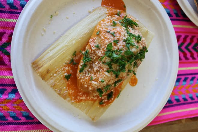 Small, traditional Guatemalan tamal filled with chicken, wrapped in corn husk, topped with homemade tomato sauce cheese,and parsely / tamales pequeños tradicionales de Guatemala rellenos de pollo, envueltos en hoja de maíz y cubiertos de salsa de tomate al estilo chapin queso, y perijil.