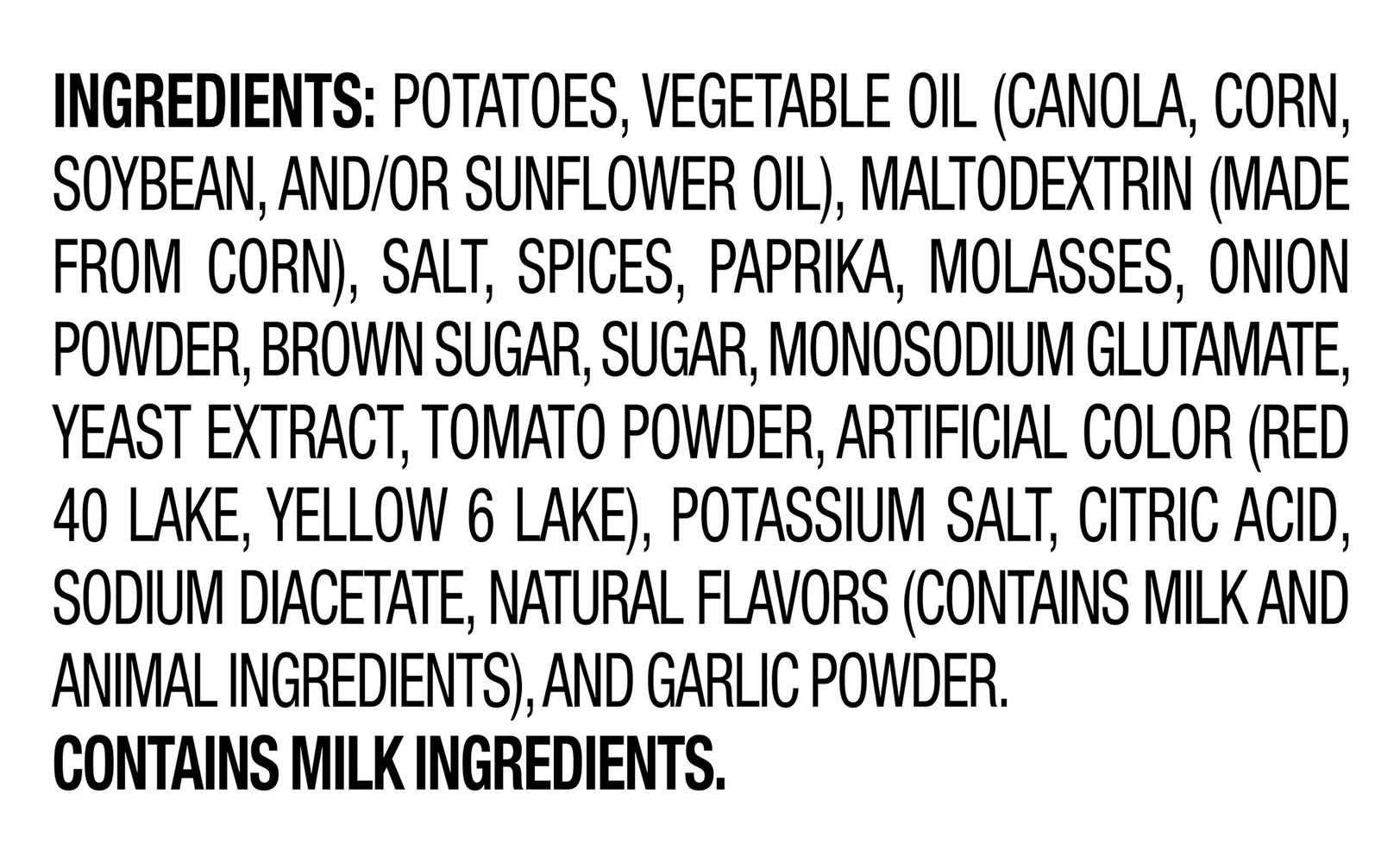 Ingredients: Potatoes, Vegetable Oil (Canola, Corn, Soybean, and/or Sunflower Oil), Maltodextrin (Made from Corn), Salt, Spices, Paprika, Molasses, Onion Powder, Brown Sugar, Sugar, Monosodium Glutamate, Yeast Extract, Tomato Powder, Artificial Color (Red 40 Lake, Yellow 6 Lake), Potassium Salt, Citric Acid, Sodium Diacetate, Natural Flavors (Contains Milk and Animal Ingredients), and Garlic Powder Contains: Milk, Corn, Soybeans