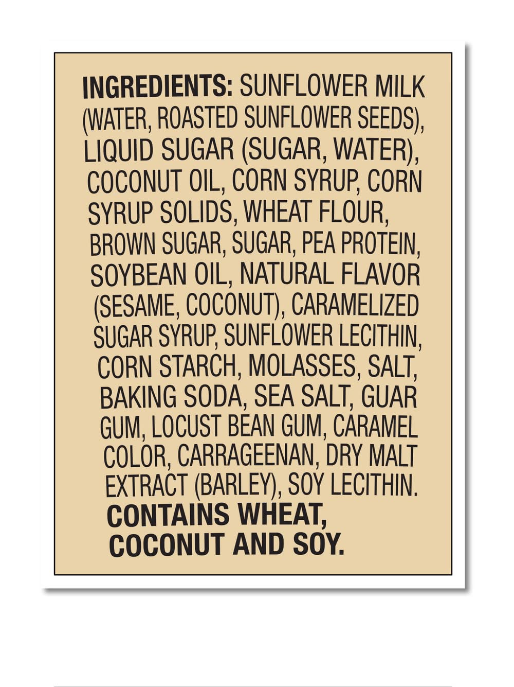 Ingredients: Sunflower Milk Water, Roasted Sunflower Seeds, Liquid Sugar Sugar, Water, Coconut Oil, Corn Syrup, Corn Syrup Solids, Wheat Flour, Brown Sugar, Sugar, Pea Protein, Soybean Oil, Natural Flavor Sesame, Coconut, Caramelized Sugar Syrup, Sunflower Lecithin, Corn Starch, Molasses, Salt, Baking Soda, Sea Salt, Guar Gum, Locust Bean Gum, Caramel Color, Carrageenan, Dry Malt Extract Barley, Soy Lecithin. Contains: 'Contains Wheat', 'Contains Tree Nuts', 'Contains Soybeans'