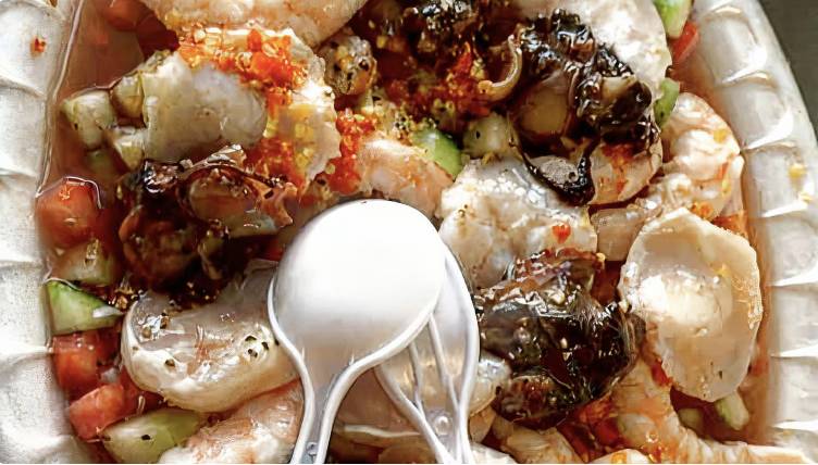 ceviche de camaron, camaron cocido, jaiba, pulpo y pata de mula