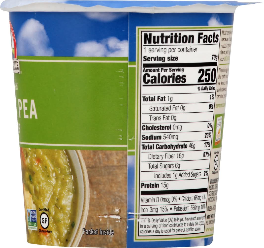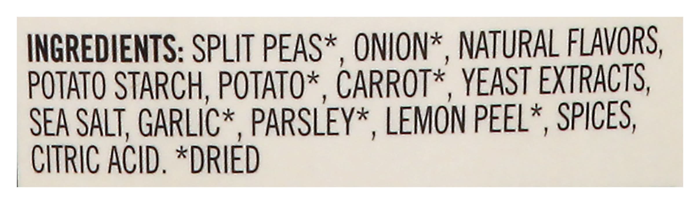 Ingredients: Split Peas (Dried), Onion (Dried), Natural Flavors, Potato Starch, Potato (Dried), Carrot (Dried), Yeast Extract, Sea Salt, Garlic (Dried), Parsley (Dried), Lemon Peel (Dried), Spices, Citric Acid Contains: Peanuts
