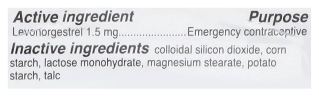 Ingredients: Active Ingredients: Levonorgestrel (1.5 mg), Emergency Contraceptive. Inactive Ingredients: Colloidal Silicon Dioxide, Corn Starch, Lactose Monohydrate, Magnesium Stearate, Potato Starch, Talc Additives: Colloidal Silicon Dioxide, Corn Starch, Lactose Monohydrate, Magnesium Stearate, Potato Starch, Talc