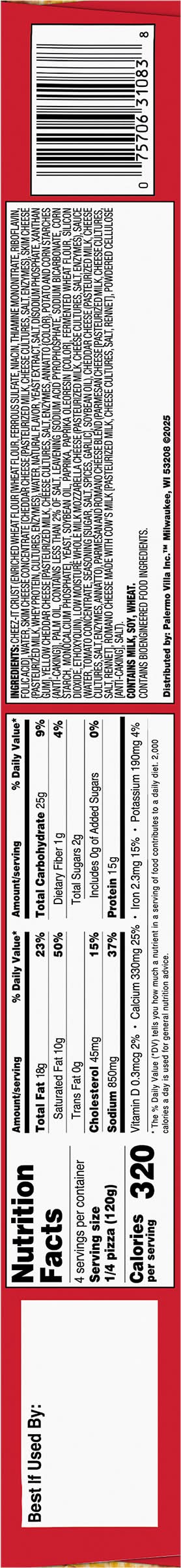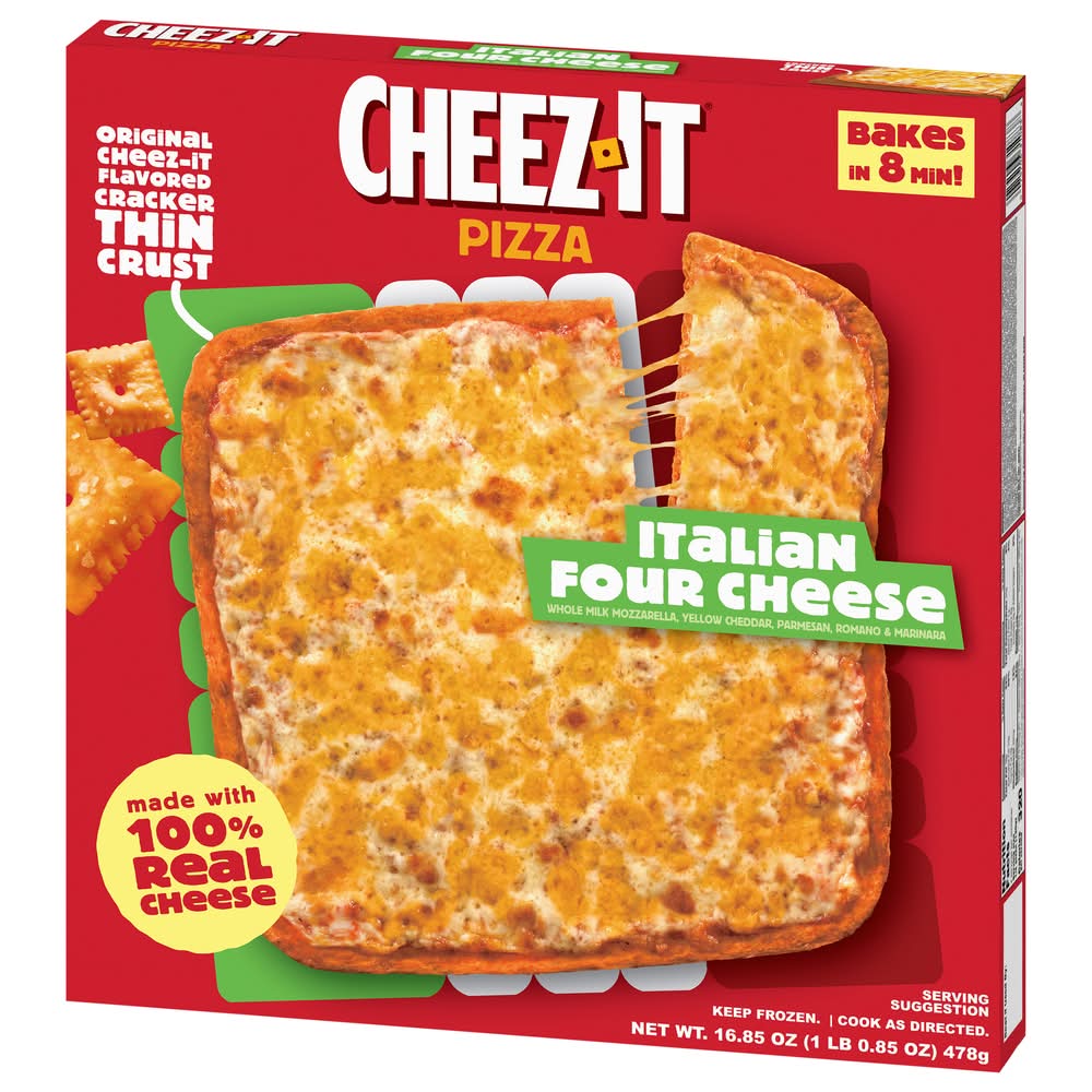 Whole milk mozzarella, yellow cheddar, parmesan, romano & marinara. Contains bioengineered food ingredients. Bakes in 8 min! Original cheez-it flavored cracker thin crust. Cracker thin crust. Want it. Need it. Cheez-it. If you love Cheez-its and pizza, you're in luck, as the Cheez-it taste you love is now in a pizza! Introducing Cheez-It Pizza, a giant, ultra-thin, and crispy original Cheez-It flavored crust made with 100% real cheese, paired with your favorite pizza toppings to remind you of the irresistible, cheesy flavor you love. This pizza boasts one of the shortest baking times around so you can enjoy cheesy, crunchy satisfaction in minutes! Pizza night will never be the same. Our Guarantee: We guarantee you will love our pizza or we will give you a replacement. For questions and comments on your Pizza experience manufactured under license by Palermo Villa, Inc., contact us at 1-888-571-7181. Snail Mail more your style? Attn: Customer Service, 3301 W. Canal St., Milwaukee, WI 53208. Please keep/include the side panel of this box with the ''Best If Used By'' area for reference. Love pizza? Then try all of our irresistibly cheesy pizza flavors! Italian four cheese. Pepperoni. Cheddar jack supreme. 100% of this carton is recyclable. Flavor: Italian four cheese