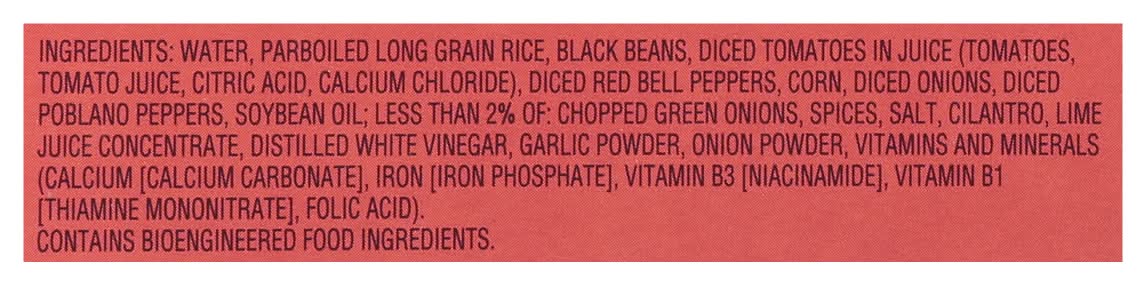 Ingredients: Water, Parboiled Long Grain Rice, Black Beans, Diced Tomatoes in Juice (Tomatoes, Tomato Juice, Citric Acid, Calcium Chloride), Diced Red Bell Peppers, Corn, Diced Onions, Diced Poblano Peppers, Soybean Oil; Less than 2% of: Chopped Green Onions, Spices, Salt, Cilantro, Lime Juice Concentrate, Distilled White Vinegar, Garlic Powder, Onion Powder, Vitamins and Minerals (Calcium [Calcium Carbonate], Iron [Iron Phosphate), Vitamin B3 [Niacinamide), Vitamin B1 [Thiamine Mononitrate], Folic Acid). Contains: Corn, Soybeans