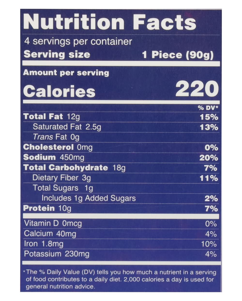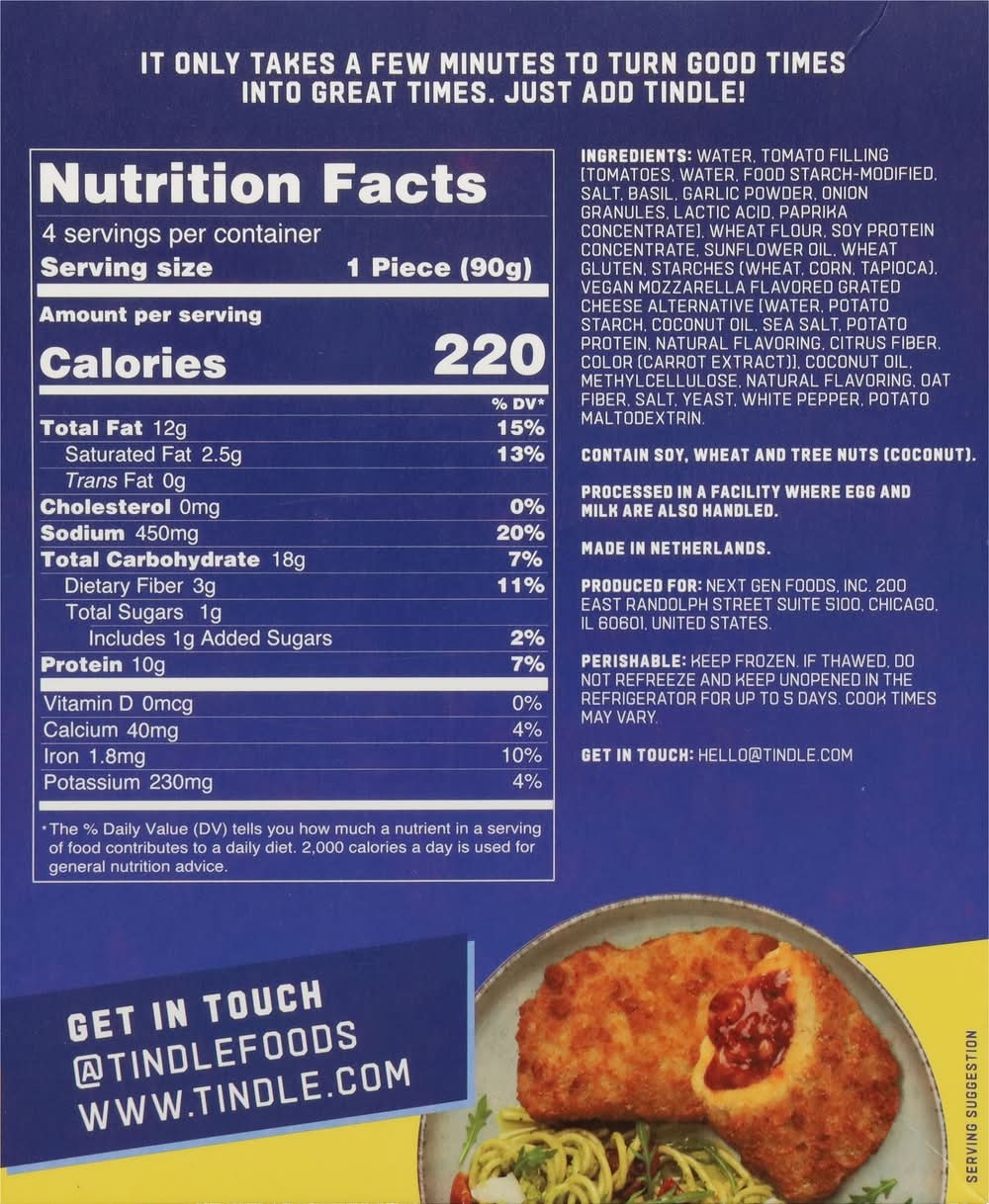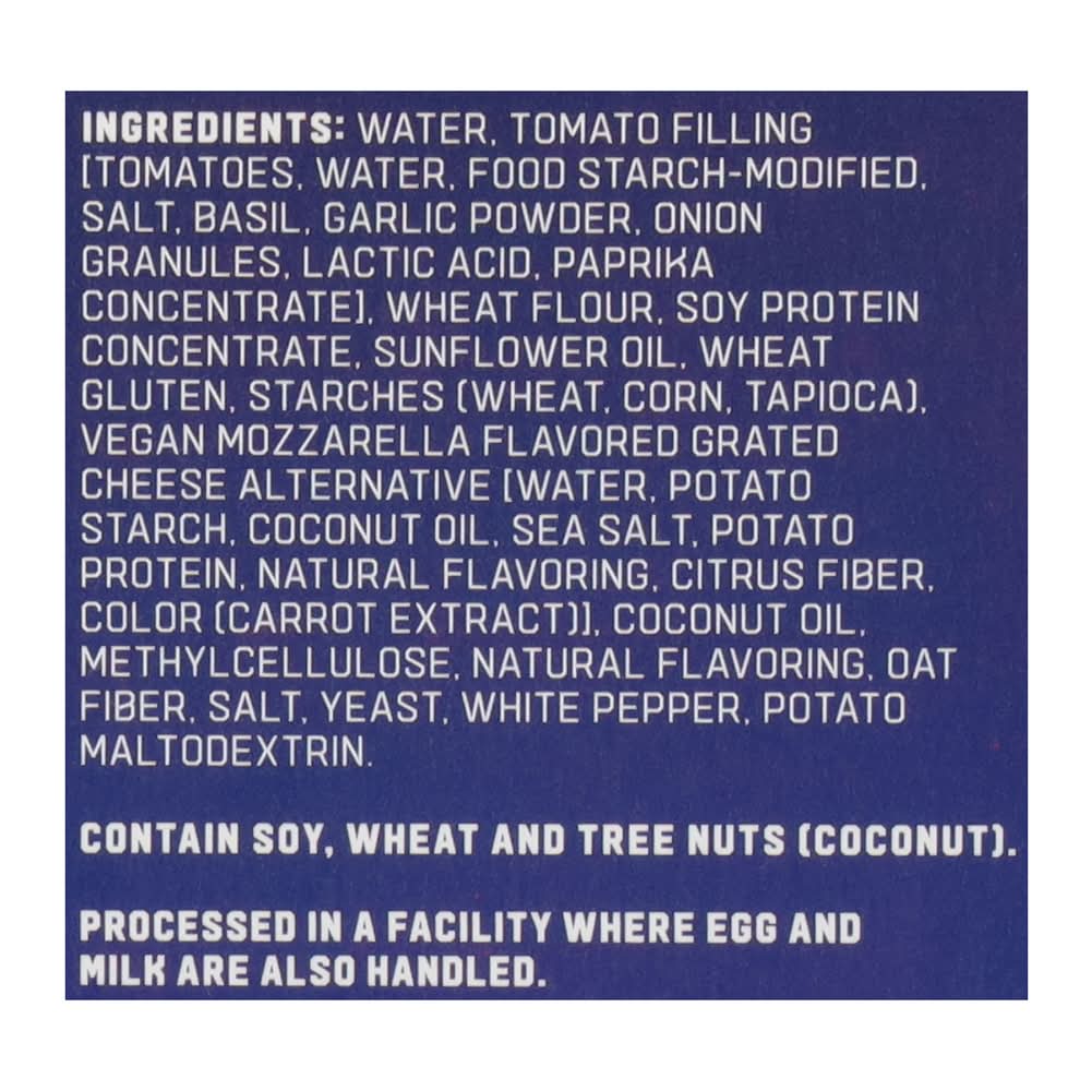 Ingredients: Water, Tomato Filling (Tomatoes, Water, Food Starch-Modified, Salt, Basil, Garlic Powder, Onion Granules, Lactic Acid, Paprika Concentrate), Wheat Flour, Soy Protein Concentrate, Sunflower Oil, Wheat Gluten, Starches (Wheat, Corn, Tapioca), Vegan Mozzarella Flavored Grated Cheese Alternative (Water, Potato Starch, Coconut Oil, Sea Salt, Potato Protein, Natural Flavoring, Citrus Fiber, Color (Carrot Extract)), Coconut Oil, Methylcellulose, Natural Flavoring, Oat Fiber, Salt, Yeast, White Pepper, Potato Maltodextrin Contains: Soybeans, Wheat, Tree Nuts, Tree Nuts, Coconuts, Gluten, Corn, Oat, Eggs, Milk