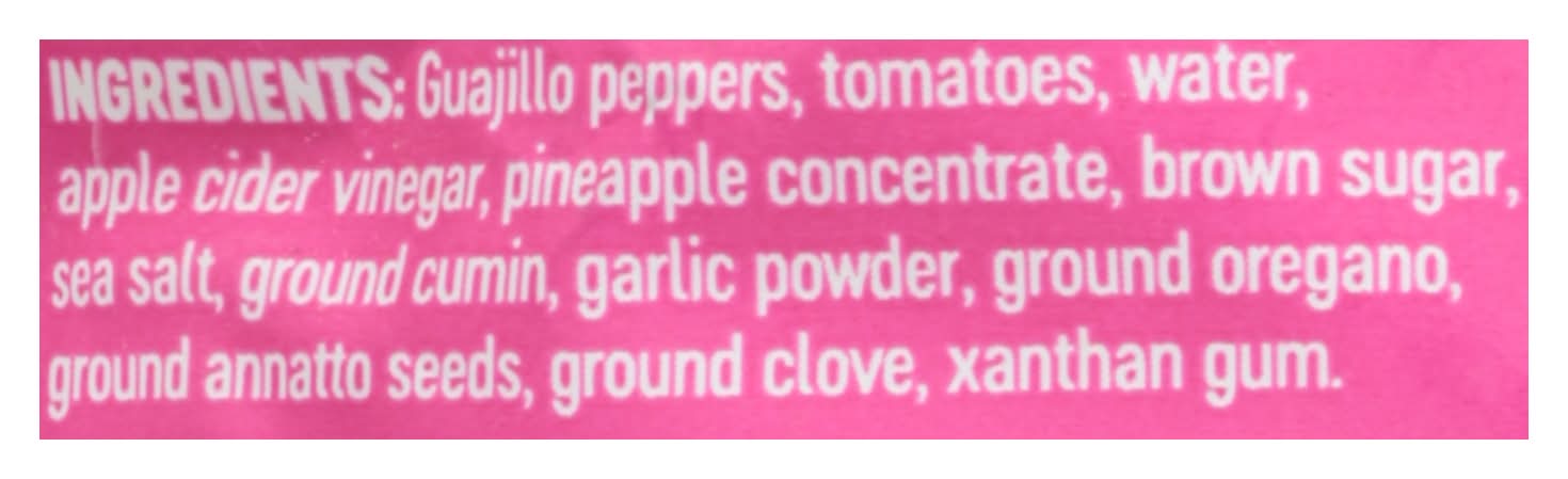 Ingredients: Guajillo Peppers, Tomatoes, Water, Apple Cider Vinegar, Pineapple Concentrate, Brown Sugar, Sea Salt, Ground Cumin, Garlic Powder, Ground Oregano, Ground Annatto Seeds, Ground Clove, Xanthan Gum