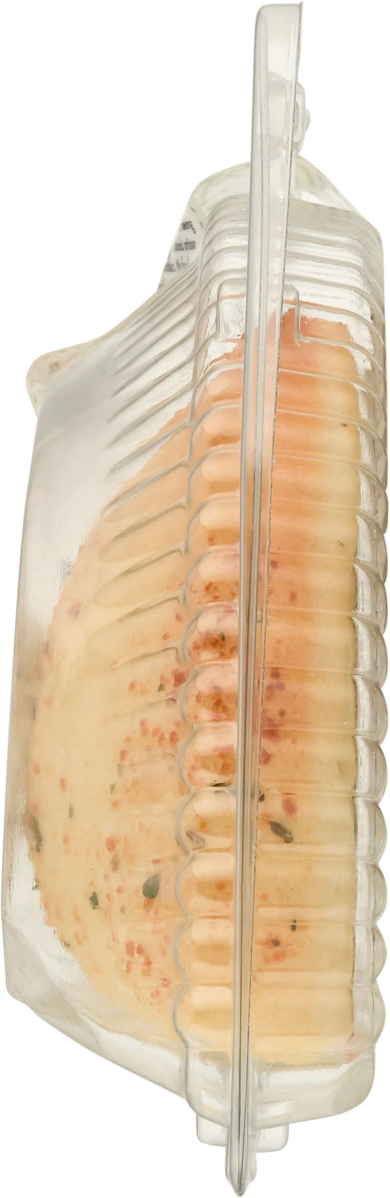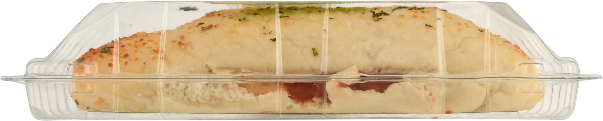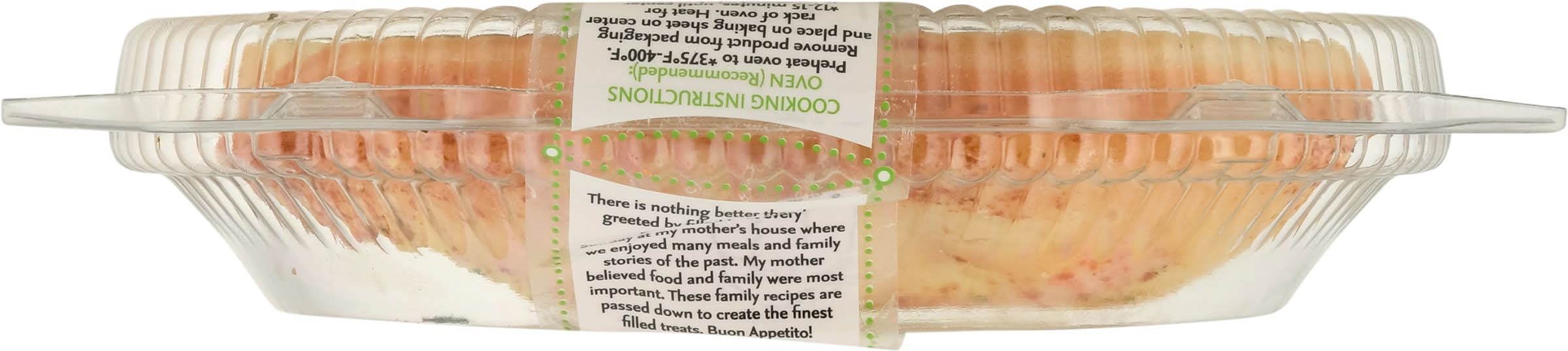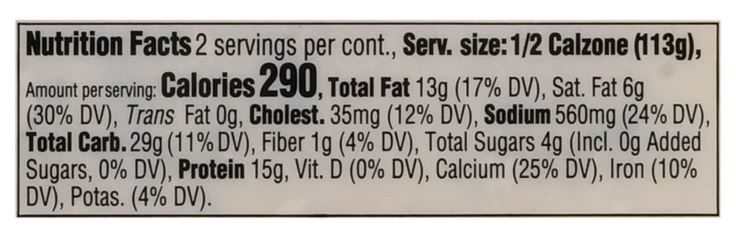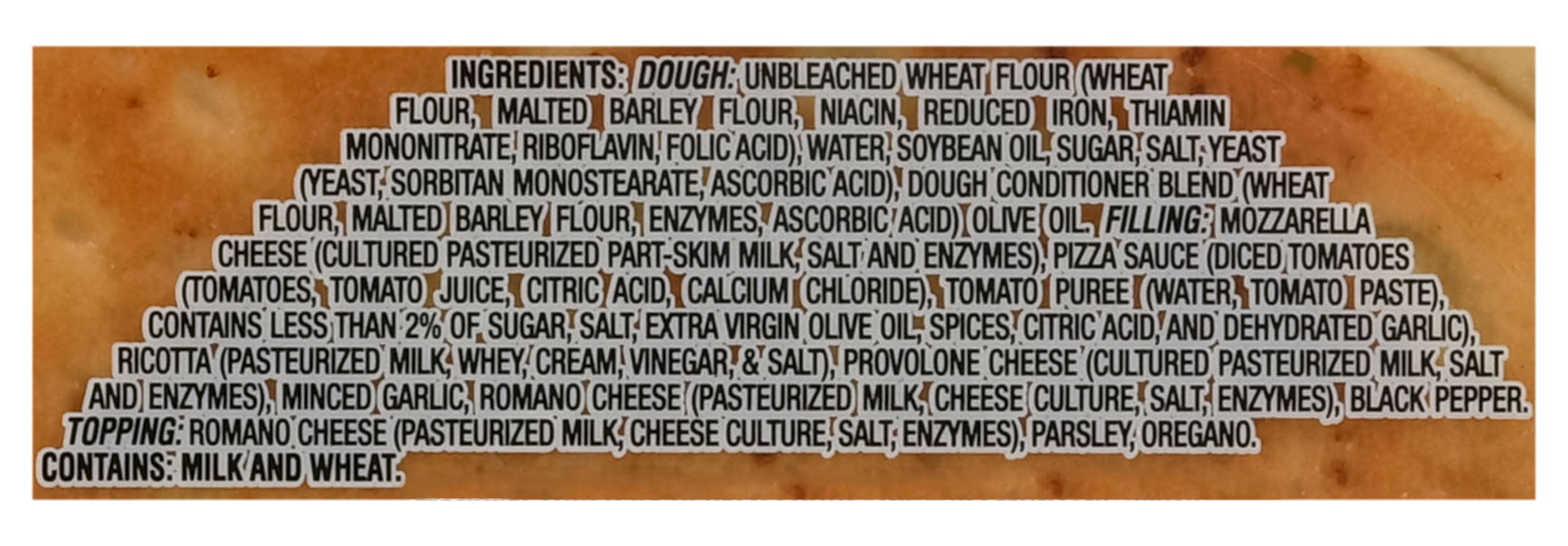 Ingredients: Dough: Unbleached Wheat Flour (Wheat Flour, Malted Barley Flour, Niacin, Reduced Iron, Thiamin Mononitrate Riboflavin, Folic Acid), Water, Soybean Oil, Sugar, Salt, Yeast (Yeast, Sorbitan Monostearate, Ascorbic Acid), Dough Conditioner Blend (Wheat Flour, Malted Barley Flour, Enzymes, Ascorbic Acid) Olive Oil Filling: Mozzarella Cheese (Cultured Pasteurized Part-Skim Milk, Salt and Enzymes), Pizza Sauce (Diced Tomatoes (Tomatoes, Tomato Juice, Citric Acid, Calcium Chloride), Tomato Puree (Water, Tomato) Paste), Contains Less than 2% of Sugar, Salt, Extra Virgin Olive Oil, Spices, Citric Acid, and Dehydrated Garlic), Ricotta (Pasteurized Milk, Whey, Cream, Vinegar, & Salt), Provolone Cheese (Cultured Pasteurized Milk, Salt and Enzymes), Minced Garlic, Romano Cheese (Pasteurized) Milk, Cheese Culture, Salt, Enzymes), Black Pepper. Topping: Romano Cheese (Pasteurized Milk, Cheese Culture, Salt; Enzymes), Parsley, Oregano Contains: Milk, Wheat, Barley, Soybeans