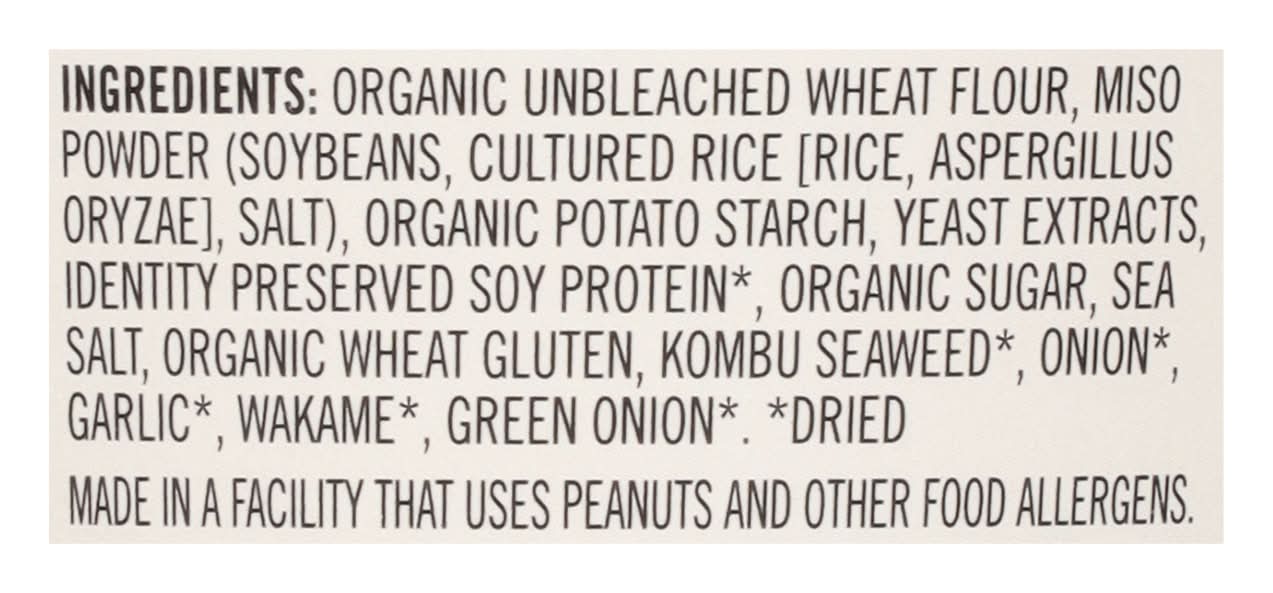 Ingredients: Organic Unbleached Wheat Flour, Miso Powder (Soybeans, Cultured Rice [Rice, Aspergillus Oryzae], Salt), Organic Potato Starch, Yeast Extracts, Identity Preserved Soy Protein (Dried), Organic Sugar, Sea Salt, Organic Wheat Gluten, Kombu Seaweed (Dried), Onion (Dried) Garlic (Dried), Wakame (Dried), Green Onion (Dried) Contains: Wheat, Soybeans, Gluten, Peanuts