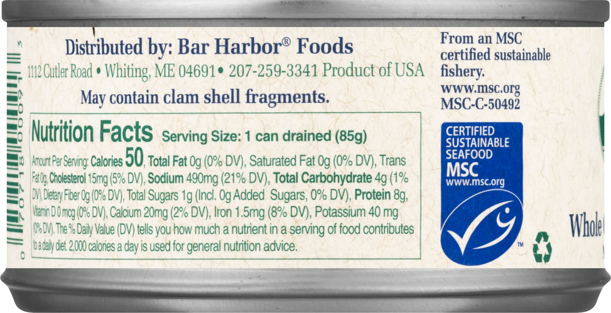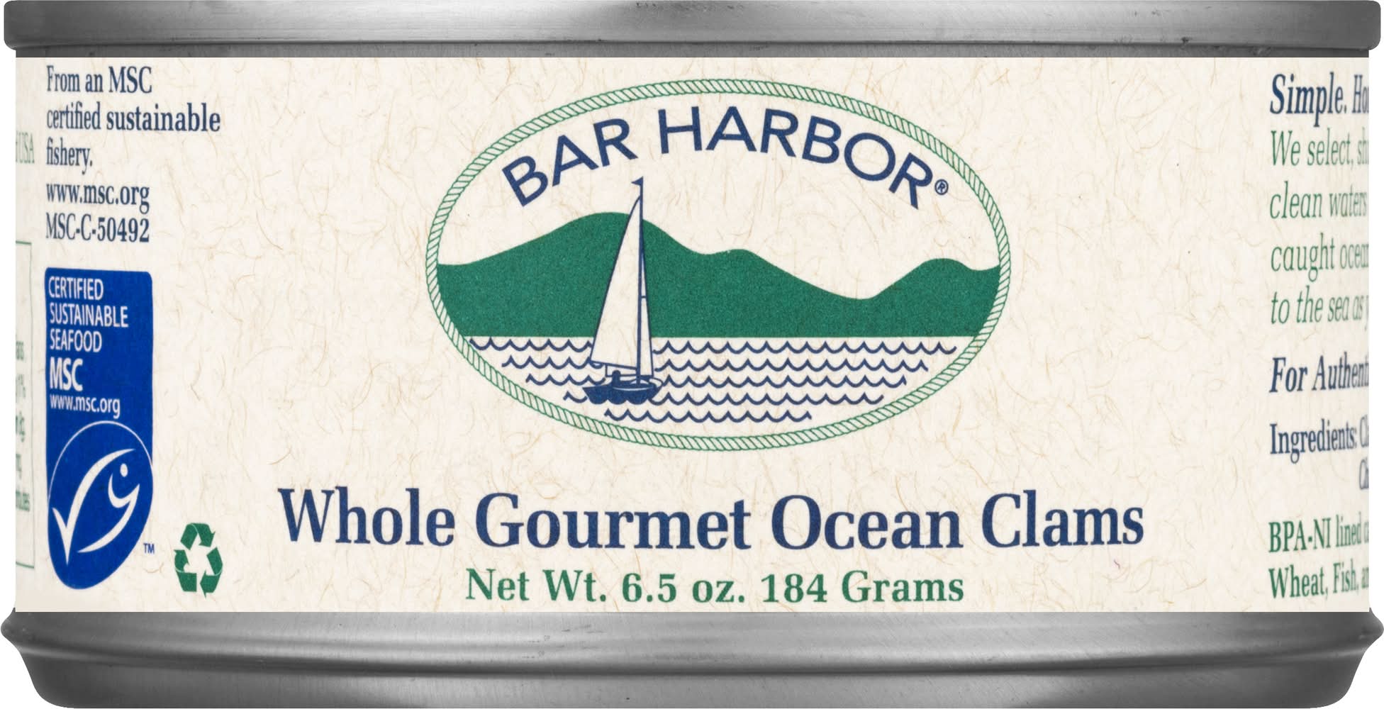 Ocean Clams, Gourmet, Whole • Bar Harbor Foods, 1112 Cutler Road, Whiting, ME, 04691 • Packaging: Reusable