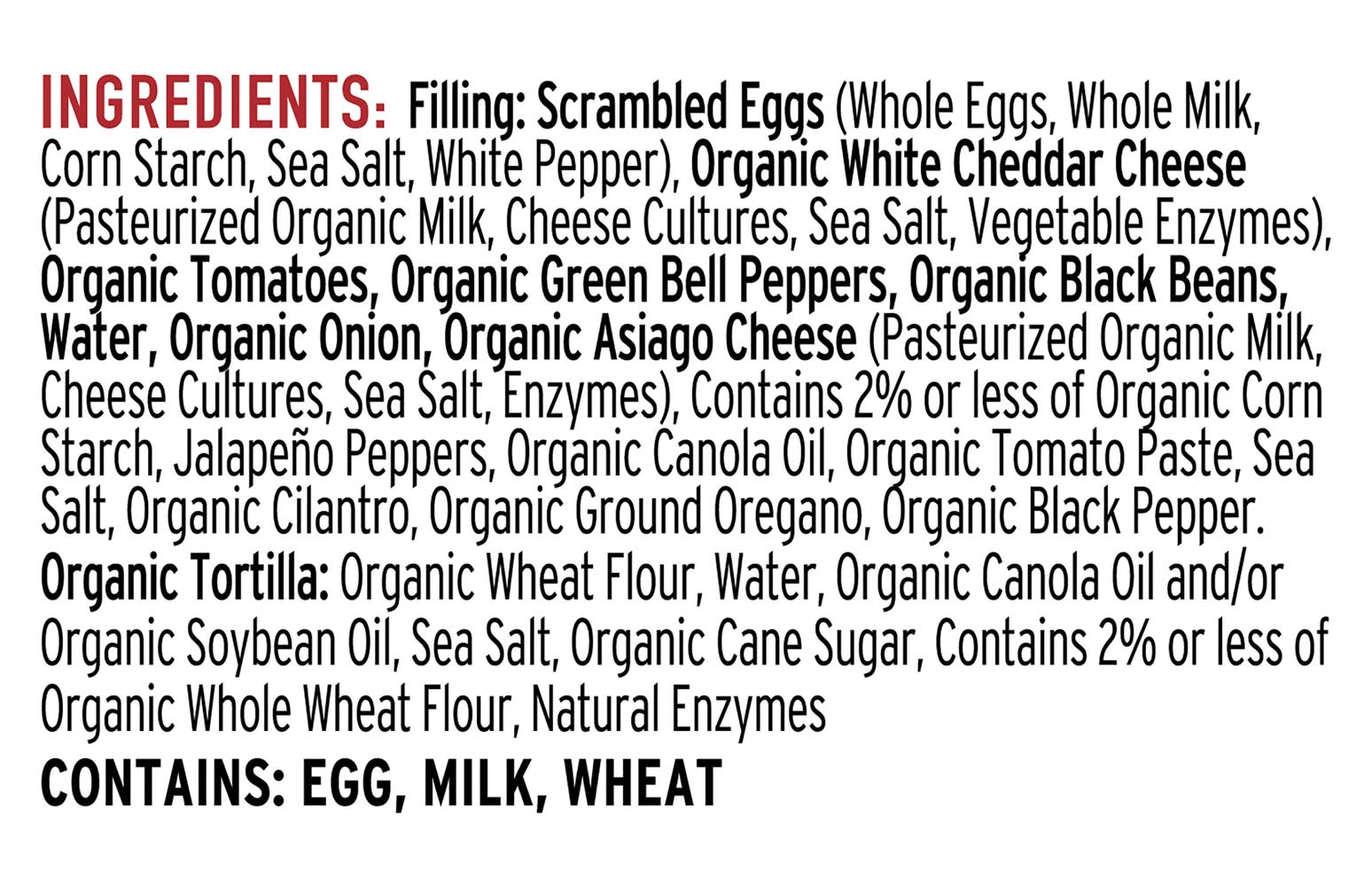 Ingredients: Filling: Scrambled Eggs (Whole Eggs, Whole Milk, Corn Starch, Sea Salt, White Pepper), Organic White Cheddar Cheese (Pasteurized Organic Milk, Cheese Cultures, Sea Salt, Vegetable Enzymes), Organic Tomatoes, Organic Green Bell Peppers, Organic Black Beans, Water, Organic Onion, Organic Asiago Cheese (Pasteurized Organic Milk, Cheese Cultures, Sea Salt, Enzymes), Contains 2% or Less of Organic Corn Starch, Jalapeno Peppers, Organic Canola Oil, Organic Tomato Paste, Sea Salt, Organic Cilantro, Organic Ground Oregano, Organic Black Pepper. Organic Tortilla: Organic Wheat Flour, Water, Organic Canola Oil and/or Organic Soybean Oil, Sea Salt, Organic Cane Sugar, Contains 2% or Less of Organic Whole Wheat Flour, Natural Enzymes Contains: Eggs, Milk, Wheat, Soybeans
