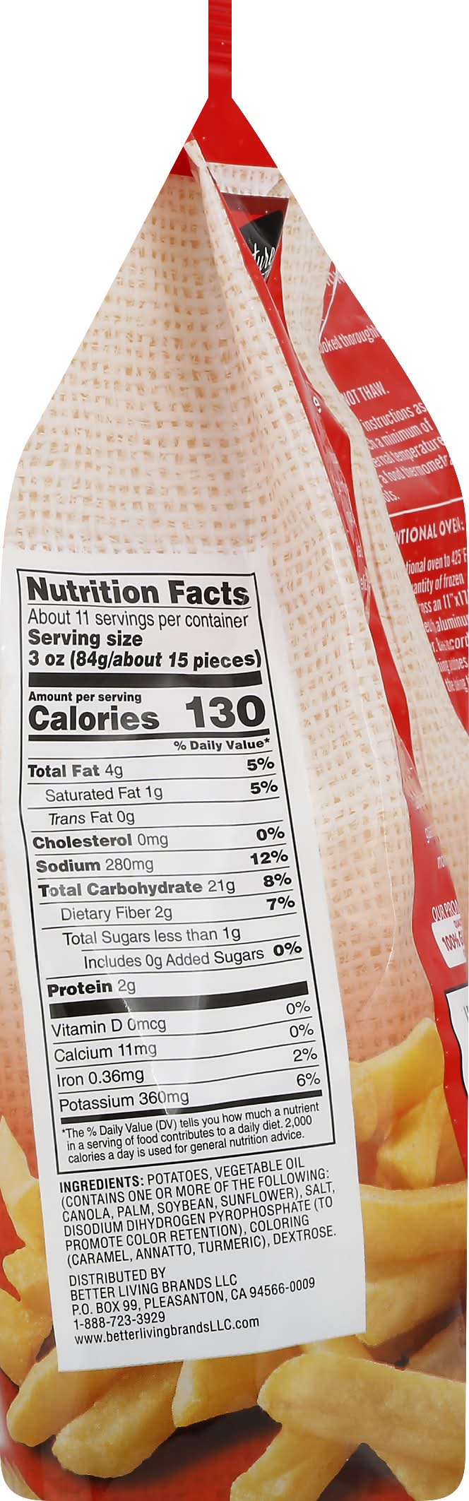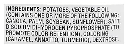 Ingredients: Potatoes, Vegetable Oil (Contains One or More of the Following: Canola, Palm, Soybean, Sunflower), Salt, Disodium Dihydrogen Pyrophosphate (to Promote Color Retention), Coloring (Caramel, Annatto, Turmeric), Dextrose. Contains: Soybeans