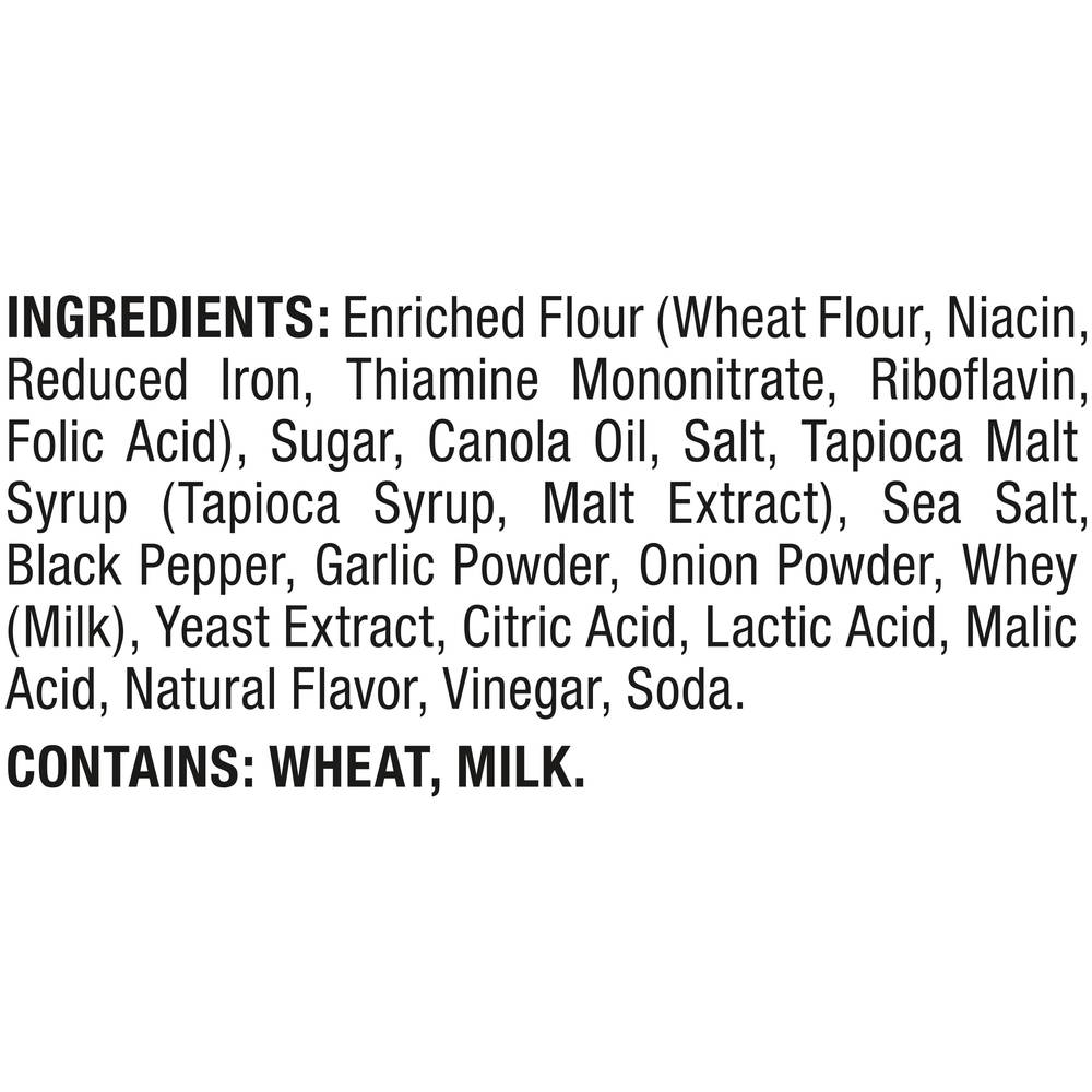 Ingredients: INGREDIENTS: ENRICHED FLOUR (WHEAT FLOUR, NIACIN, REDUCED IRON, THIAMINE MONONITRATE, RIBOFLAVIN, FOLIC ACID), SUGAR, CANOLA OIL, SALT, TAPIOCA MALT SYRUP (TAPIOCA SYRUP, MALT EXTRACT), SEA SALT, BLACK PEPPER, GARLIC POWDER, ONION POWDER, WHEY (MILK), YEAST EXTRACT, CITRIC ACID, LACTIC ACID, MALIC ACID, NATURAL FLAVOR, VINEGAR, SODA. CONTAINS: WHEAT, MILK. Contains: CONTAINS: Gluten, Milk/Dairy, Wheat